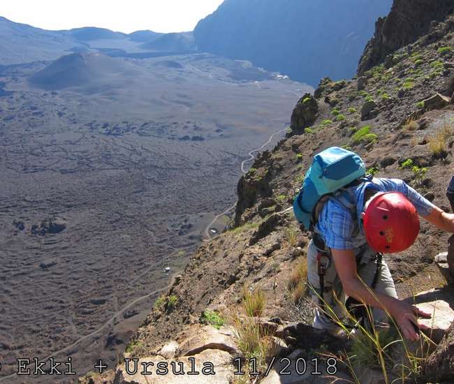 Zunächst leicht ausschreitende geht es fast eben über losen Lavagrus zum Ausgangspunkt der Tour. Der Weg zieht sich zunehmend steiler bergan mit immer wieder neuen, atemberaubenden Ausblicken über die Caldeira. Im oberen Drittel wid es noch steiler und Sie steigen, klettern nun über grosse Felsbrocken, Felsrippen welche sicheren Halt für die Füße bieten stetig bergan, bis Sie schließlich oben angekommen in den noch rauchenden Schlund des Feuerberges blicken.