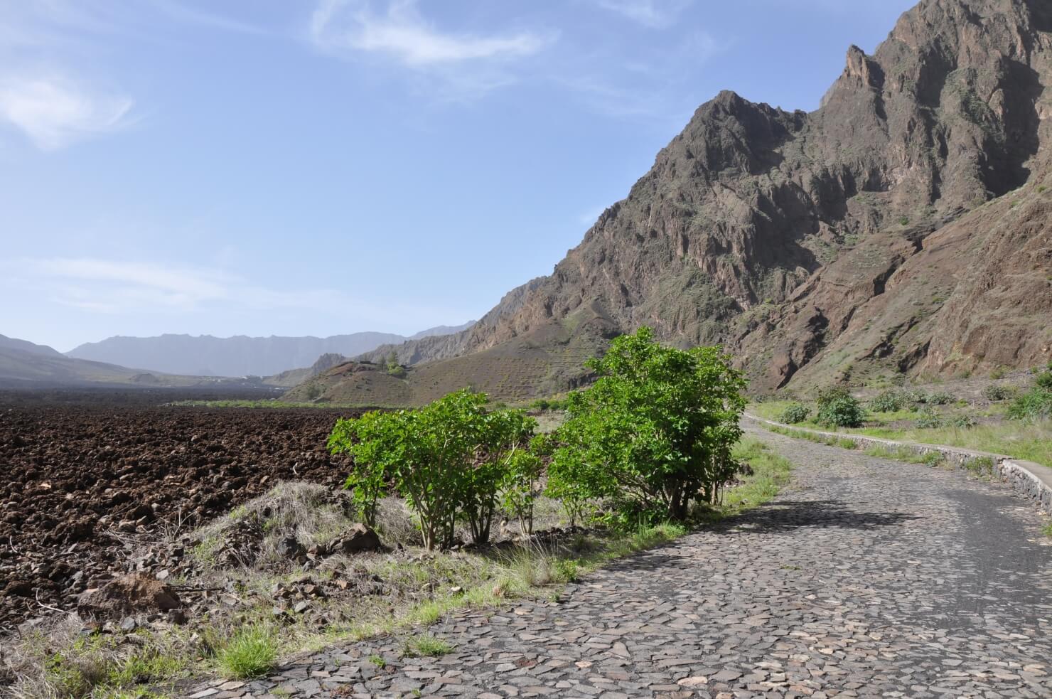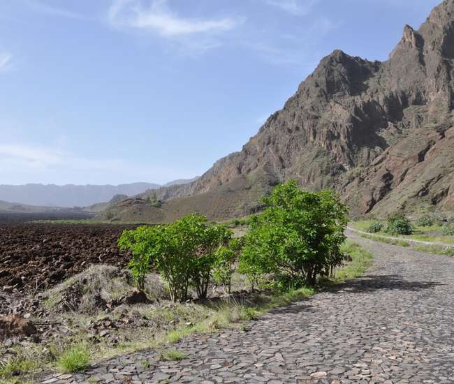 Wenn Sie zurück blicken eröffnen sich immer wieder weite Blicke auf das unendliche Meer, bis Sie schließlich in den lichten, halbeuchten Nebelwald gelangen. Auf Ihrem Weg bergan wandern Sie nun durch eines der größten zusammenhängenden Waldgebiete der Kapverden. Große Agaven stehen am Wegesrand und schillernde Eukalyptusbäume bieten Schatten auf dem Anstieg in die Caldeira. Am „Casa de Presidente“ angekommen wird der Weg zur Fahrstraße, der Sie weiter folgen bis der „Eingang“ der Caldeira erste Blicke auf den Feuerberg freigibt. Sie passieren nun verstreut bestellte Felder und immer wieder säumen rot leuchtende Rhizinusbüsche oder Purgiernußsträucher den Weg in das - nach dem verheerenden Ausbruch von 2014 - alte/neue Dorf am Fuße des Vulkans.