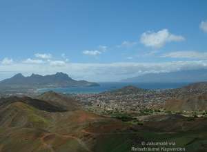 Nach einer kurzen Fahrt im bequemen Kleinbus sind wir am Fuße des Monte Verde, mit 780m die höchste Erhebung auf der Insel São Vicente. Der sich anschließende halbstündige Spaziergang auf der imposanten, kopfsteingepflasterten Bergstraße ist genau das richtige um in klarer Luft hellwach zu werden und wir genießen die Schönheit der Landschaft. Schroffe Vulkankegel wechseln sich ab mit Tafelbergen, dazwischen ausgedehnte Täler, hier und da vereinzelt kleine Siedlungen, Ziegen, die auf dem steinigen Boden nach Gräsern suchen, kapverdische Bauern, die über weite Entfernungen Neuigkeiten austauschen. Uns begegnen Frauen, die ein Bündel Feuerholz auf ihrem Kopf nach Hause tragen, Esel, so vollgepackt mit trockenen Maispflanzen, dass Kopf und Schwanz kaum zu sehen sind. Angekommen auf dem Gipfel bietet sich uns ein überwältigenderAusblick auf Mindelo und den großen Hafen, überragt von dem gewaltigen Felsmassiv des Monte Cara, dem Wahrzeichen der Stadt.