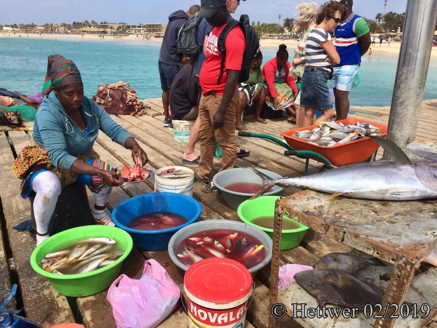Ankunft am 16.2. pünktlich 10.35 Uhr; wir schauen uns um, kein Transfer für uns weit und breit! Das fängt ja gut an, dachten wir uns und ließen uns mit dem Taxi in unser schönes, modernes und günstig gelegenes Hotel Ouril Agueda bringen. Gleich nach dem Einchecken machten wir einen ersten Rundgang durch die Stadt und zum Strand, genossen gegen Abend den Sonnenuntergang auf der Dachterrasse unseres Hotels, aßen später am Abend in der Stadt unser erstes Cachupa und wurden auf dem Rückweg zum Hotel auf dem zentralen Platz mit einer Lifeband und fröhlich tanzenden einheimischen Menschen belohnt.