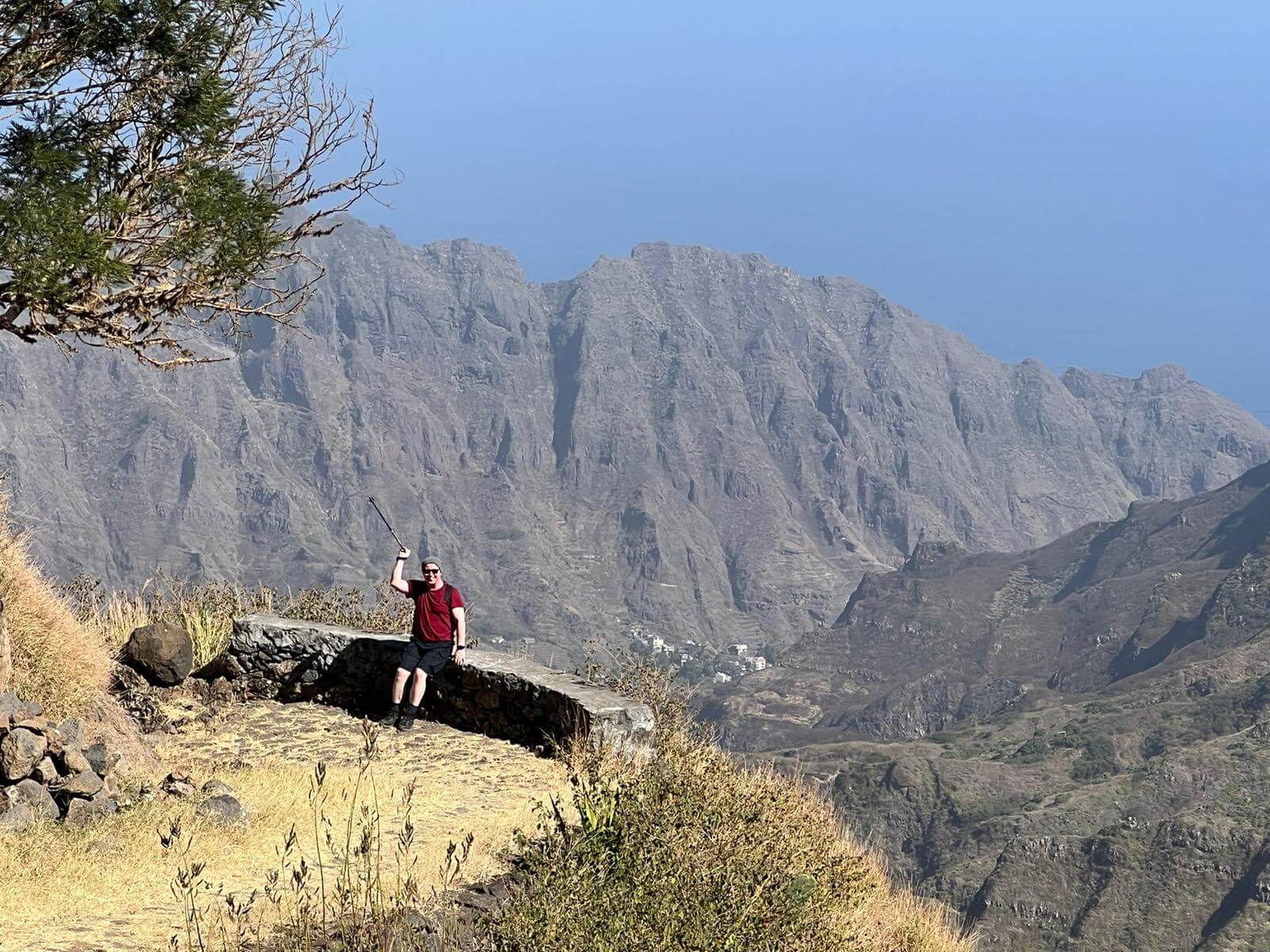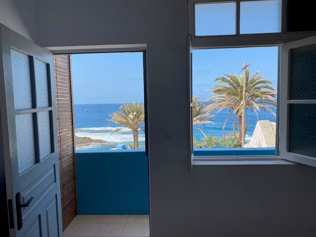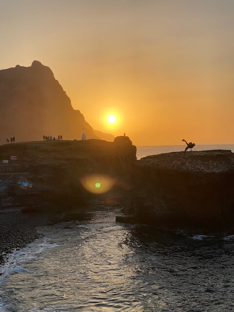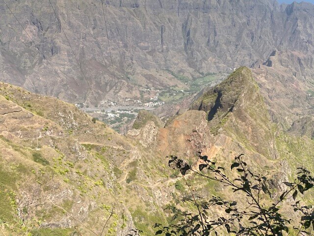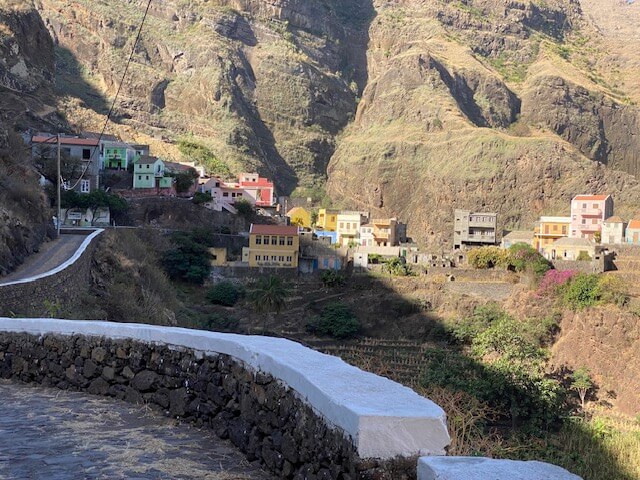 Am nächsten Morgen ging es per Schiff nach Santo Antão, eine windige Fahrt von einer Stunde nach Porto Novo mit auf die Minute pünktlicher Abfahrt. Auch dort wurden wir sofort in Empfang genommen und fuhren über den Krater Cova de Paúl nach Corda, von wo die erste Wanderung hinunter nach Coculi zum Green Place startete. Es lohnt sich, für diese Wanderungen Wanderstöcke mitzunehmen. Obwohl es nur wenige feuchte Bereiche gibt, ist festes Schuhwerk unerlässlich. Die Wanderung, obwohl meist bergab und im oberen Bereich einfach, nötigte uns Respekt ab. Man wurde immer wieder mit überwältigenden Ausblicken belohnt! Der Green Place, schon kilometerweit wegen seiner Signalfarbe zu sehen, entpuppte sich als wunderbarer Ort zum Relaxen nach der Wanderung. Unterwegs und auch dort ergaben sich immer wieder nette Kontakte mit anderen internationalen Wanderern (meist aus dem französischen Sprachraum) als auch Einheimischen. Am nächsten Tag folgte die nächste Wanderung über eine Bergkette nach Chã de Igreja, für uns anspruchsvoll, aber mit einer Pause unterwegs in Joanna‘s Bar mit üppigem Essen in Celada de Mocha auch machbar. In Chã de Igreja waren wir einfach, aber gut im Mité e Banana untergebracht und konnten etwas teilhaben am Leben in diesem wunderschönen Dorf. Von dort ging es weiter auf dem Küstenwanderweg nach Ponta de Sol. Zwei von uns gingen den Weg, wir beiden anderen ließen uns mit dem Gepäck über atemberaubende Pässe in den traumhaften Fischerort ganz im Norden der Insel bringen. Die dortige Unterkunft im direkt am Wasser gelegenen Música do Mar war für mich einer der Höhepunkte der ohnehin an positiven Eindrücken reichen Reise. Das sehr gute Abendessen dort oder im benachbarten Caleta sowie die abendliche Live-Musik und die unvergleichlichen Sonnenuntergänge brachten uns magische Momente. Die anderen wanderten an einem Tag noch durch das üppig grüne Vale do Paúl, ich „begnügte“ mich mit einer Wanderung in das spektakulär gelegene Dorf Fontainhas.