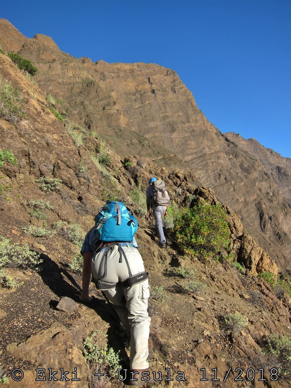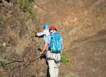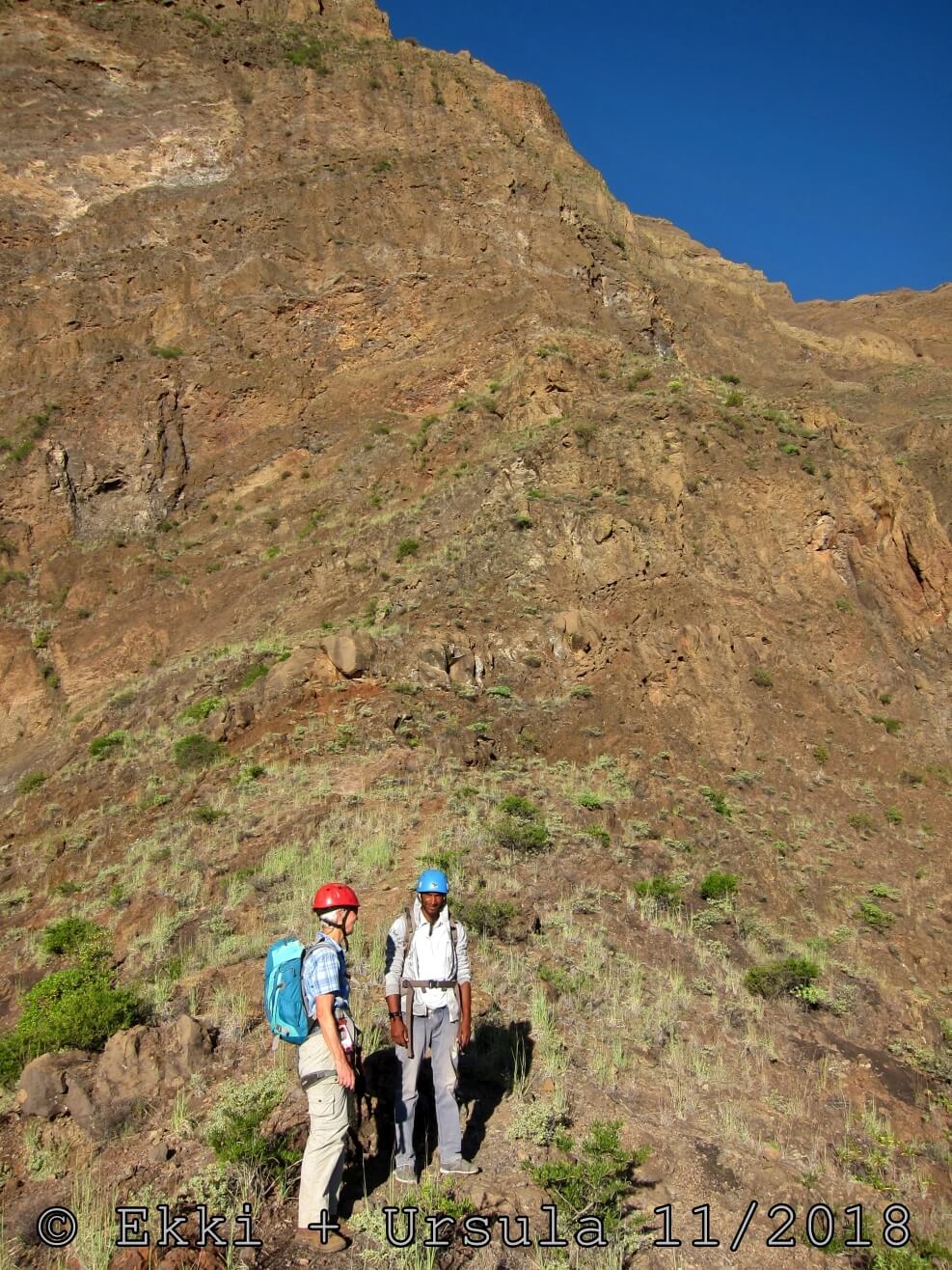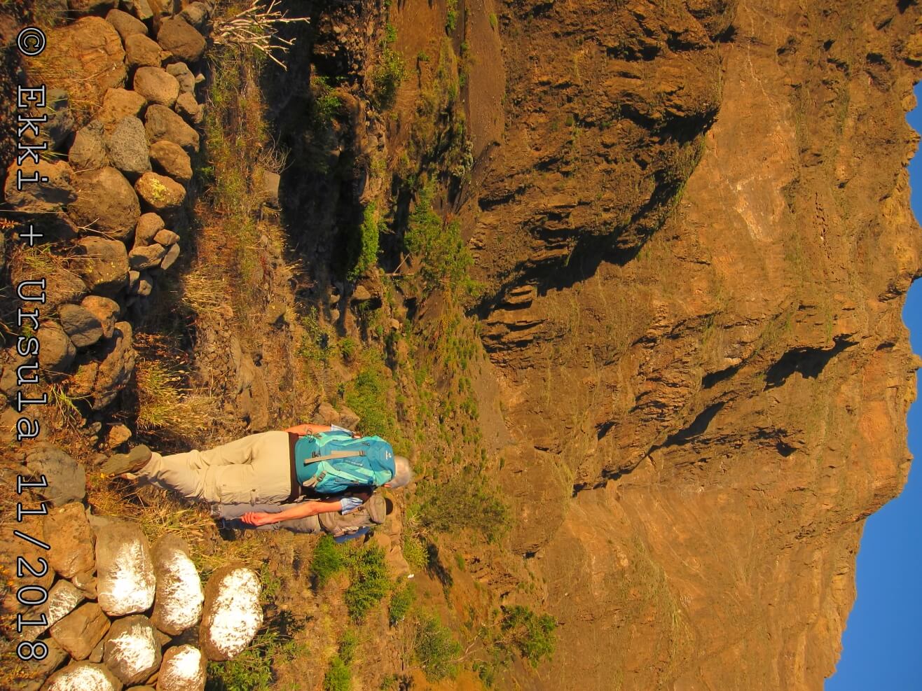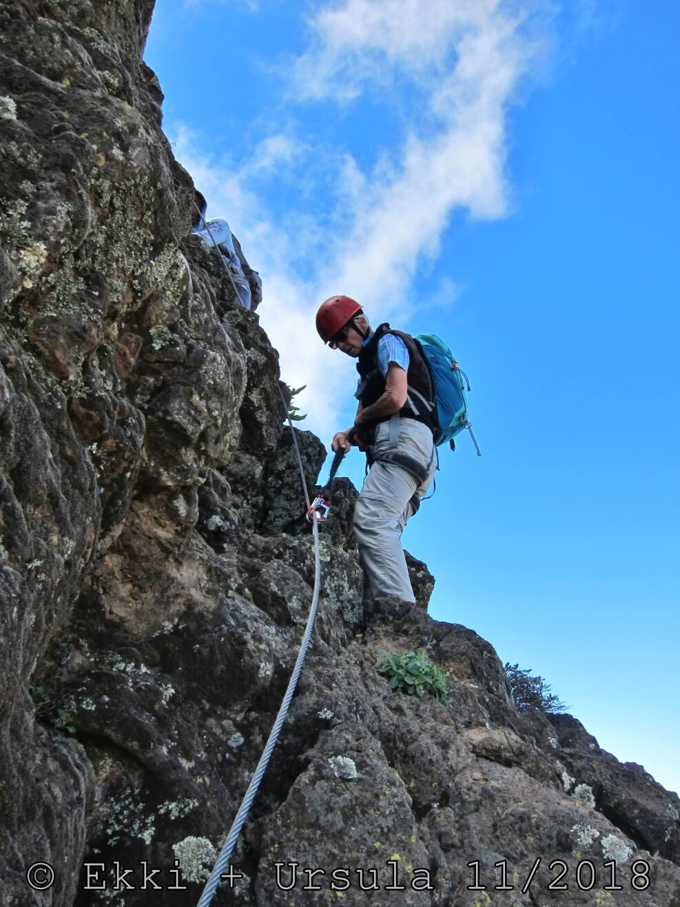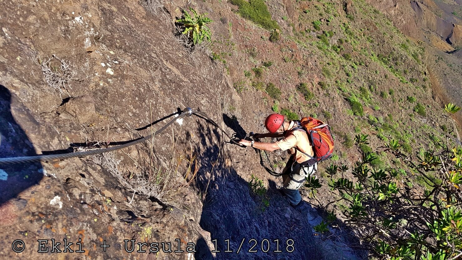 Es ist alles so wie von Pitt und von Mustafa beschrieben, wirklich „leichter“ Klettersteig, Stufe A/B . Sibylle, also den kannst Du auf alle Fälle machen, so wie ich Dich kenne, ist nicht viel schlimmer als wir mit Dir in Santiago Cidade Velha ins Ribeira Grande gestiegen sind über die Grogue Brennerei. Es ist halt nur ausgesetzter und steiler in der Bordeira Wand, das ist alles. Aber durch die Stahlseil-Sicherungen ist der Steig super sicher und. Du kannst auch die Zeiten gut abschätzen, also wir haben mit Pause in der Scharte von 9:00 Uhr (Einstieg) bis 12:45 Uhr (Gipfel Ponte Alto do Sul) = ca. 4 h von 1.750 m auf 2.400 m = 650 Hm benötigt. Aber anstrengend ist das auch, die Höhenmeter muss man steigen, senkrechter mit Bein und teilweise Handarbeit. Oben haben wir dann bis um 13:30 Uhr auf Raimar gewartet, der über den Weg 212 zum Gipfel kam, er hat also länger gebraucht als wir für den Steig. Mit ihm sind wir dann zurück über den Weg Nr. 212 gegangen bis Monte Cruz (ab 14 Uhr bis 16:30 Uhr = 2,5 Std.).