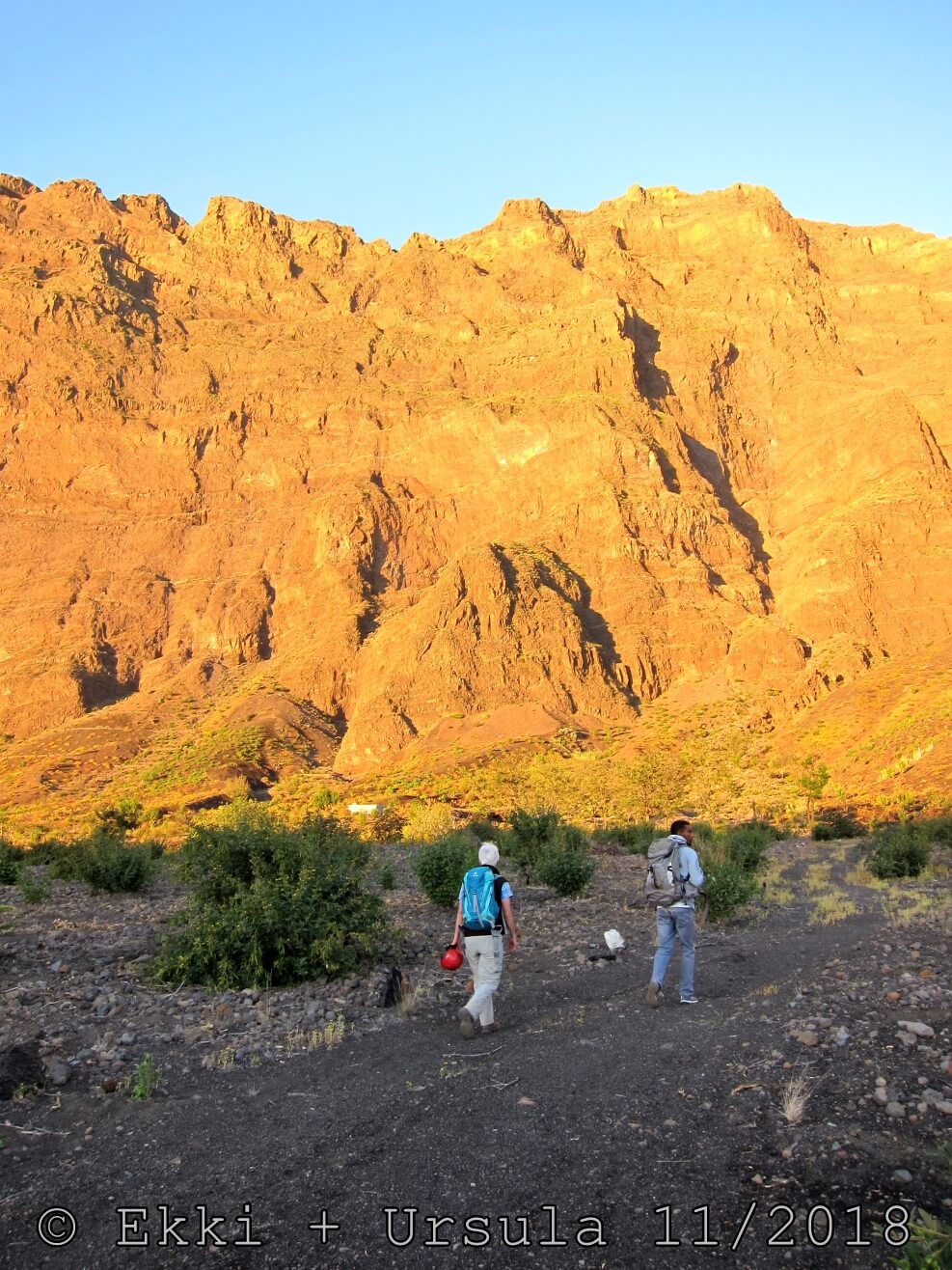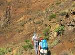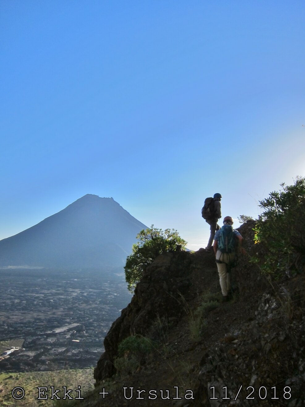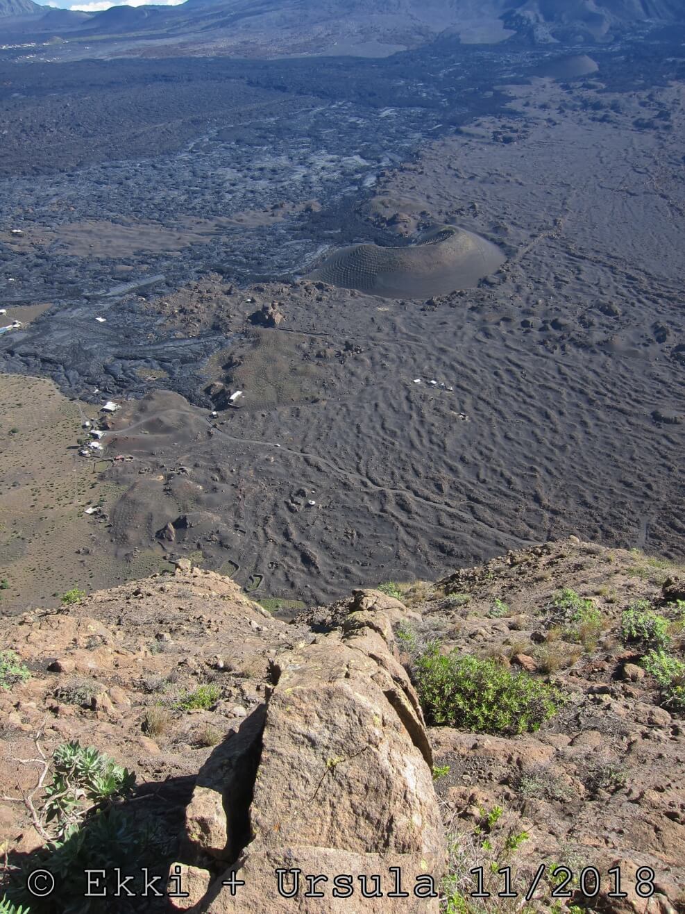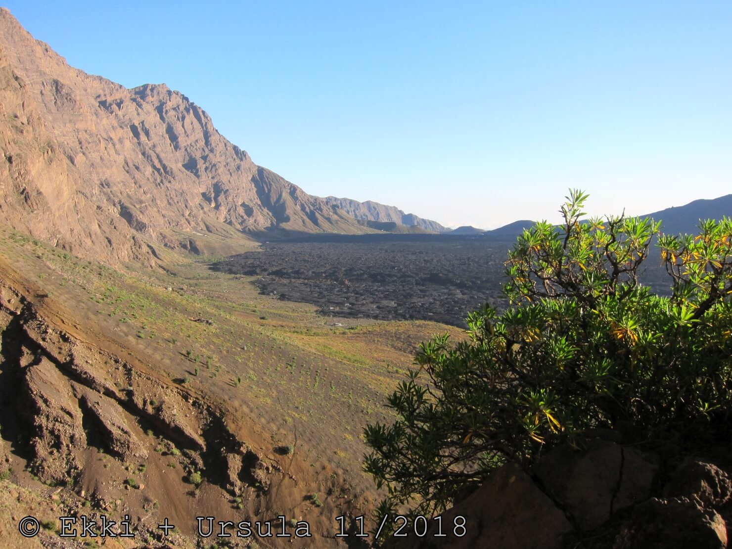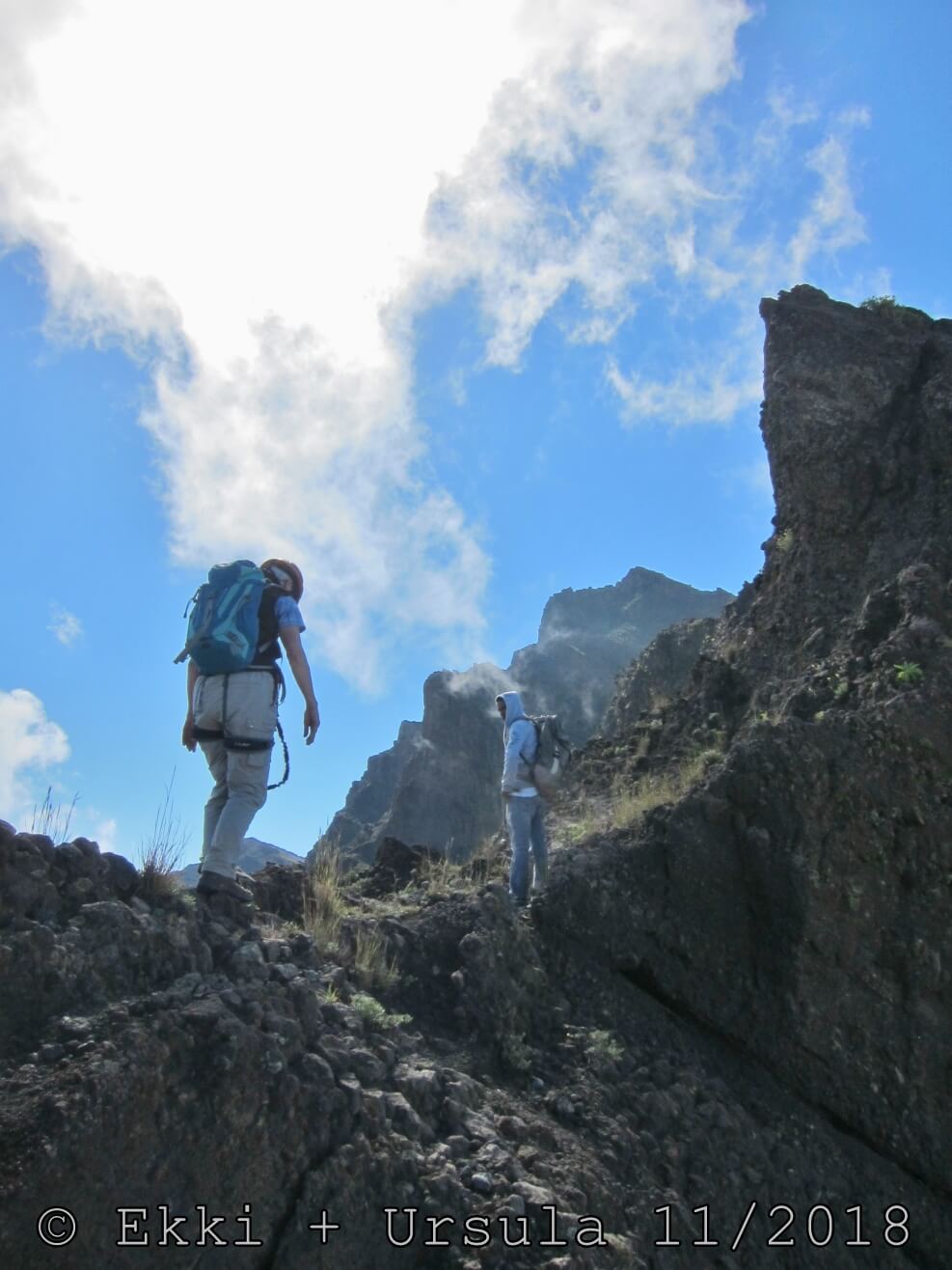 Es ist alles so wie von Pitt und von Mustafa beschrieben, wirklich „leichter“ Klettersteig, Stufe A/B . Sibylle, also den kannst Du auf alle Fälle machen, so wie ich Dich kenne, ist nicht viel schlimmer als wir mit Dir in Santiago Cidade Velha ins Ribeira Grande gestiegen sind über die Grogue Brennerei. Es ist halt nur ausgesetzter und steiler in der Bordeira Wand, das ist alles. Aber durch die Stahlseil-Sicherungen ist der Steig super sicher und. Du kannst auch die Zeiten gut abschätzen, also wir haben mit Pause in der Scharte von 9:00 Uhr (Einstieg) bis 12:45 Uhr (Gipfel Ponte Alto do Sul) = ca. 4 h von 1.750 m auf 2.400 m = 650 Hm benötigt. Aber anstrengend ist das auch, die Höhenmeter muss man steigen, senkrechter mit Bein und teilweise Handarbeit. Oben haben wir dann bis um 13:30 Uhr auf Raimar gewartet, der über den Weg 212 zum Gipfel kam, er hat also länger gebraucht als wir für den Steig. Mit ihm sind wir dann zurück über den Weg Nr. 212 gegangen bis Monte Cruz (ab 14 Uhr bis 16:30 Uhr = 2,5 Std.).