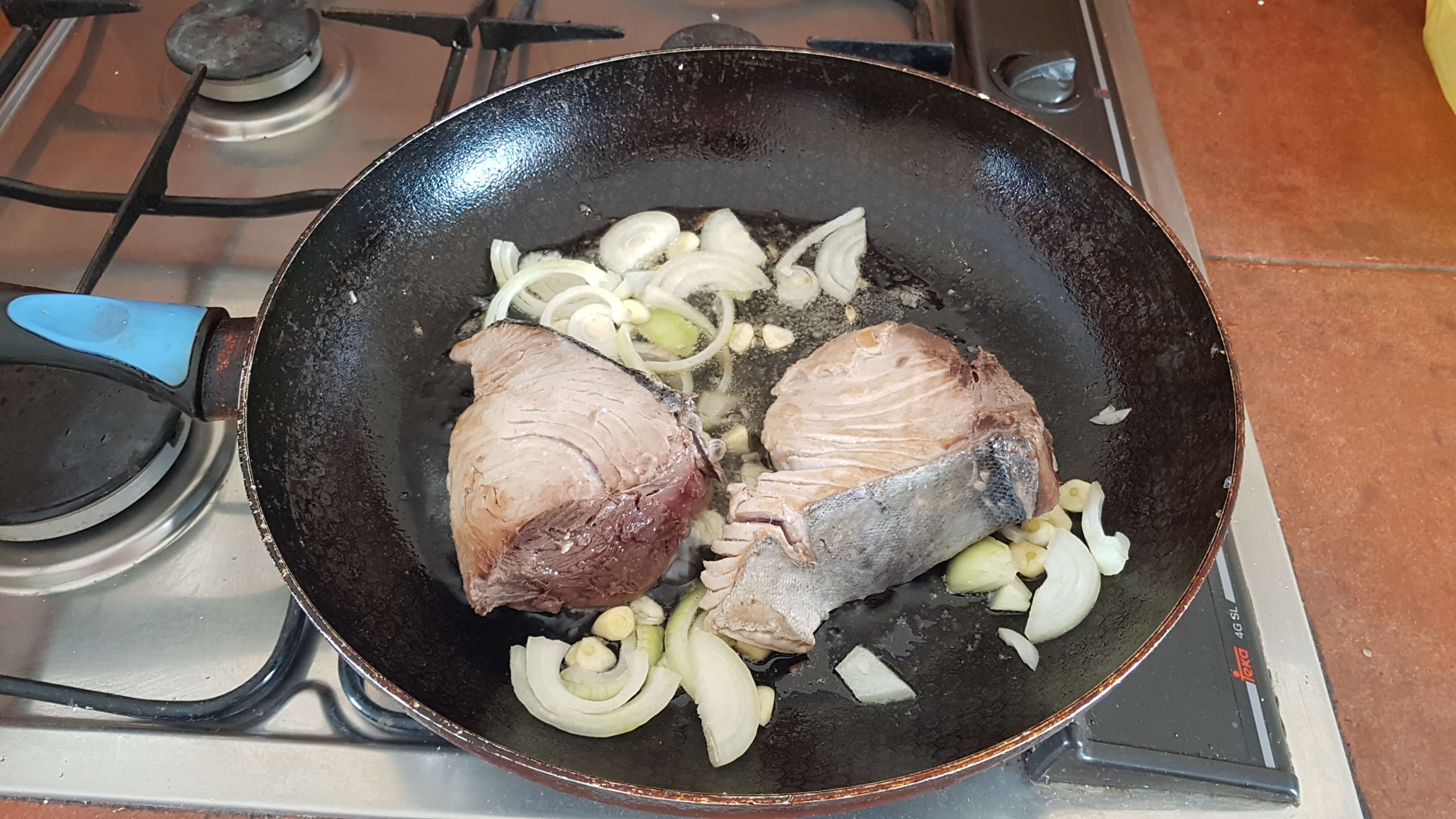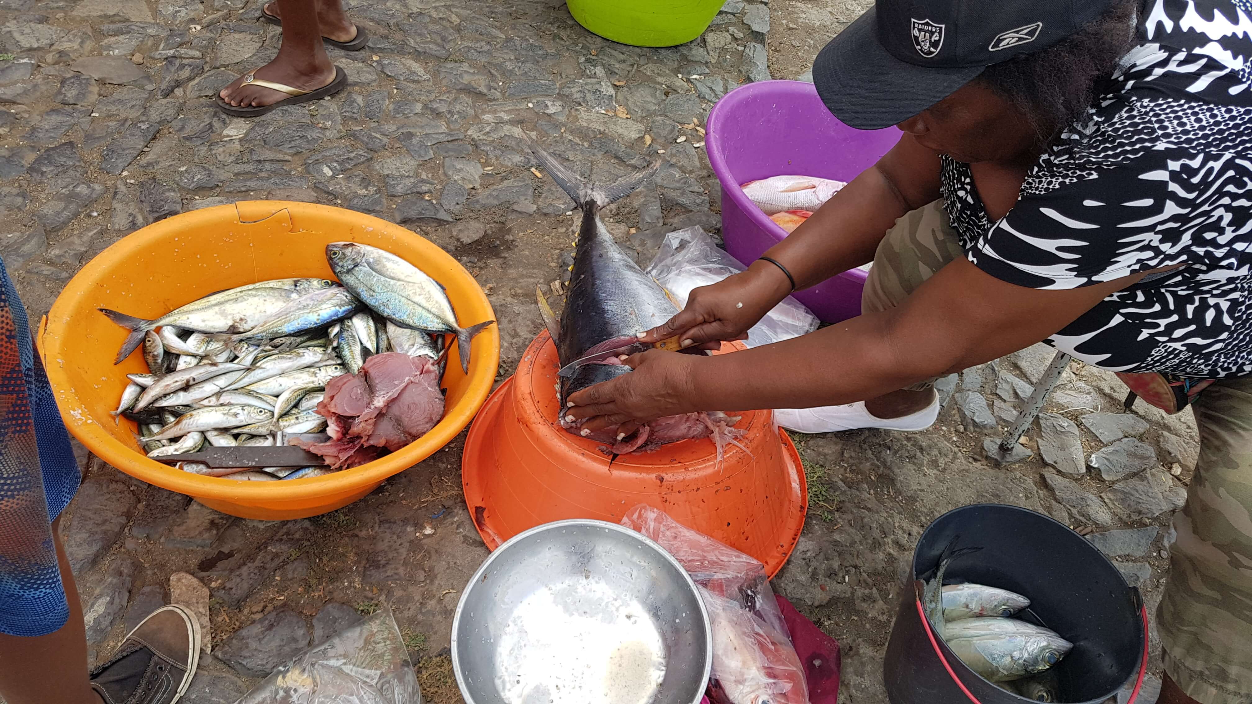 In Sao Filipe gibt es Fisch – wie in fast allen Städtchen auf Santiago und Fogo. Oft wird Thunfisch verarbeitet. Die großen Fische können sowohl fangfrisch begutachtet werden (Foto von Tarrafal), als auch an verschiedenen Stellen gekauft werden. Entweder einen der Märkte besuchen oder wie hier zu sehen auf der Straße kaufen. In der Unterkunft Casa BeiraMar gibt es ein Zimmer mit Küchenzeile. Wer eine Luxusküche erwartet wird enttäuscht. Einen (Thun-)Fisch vorzubereiten, zu braten und dann mit Meerblick auf dem eigenen Balkon zu genießen, ist problemlos machbar.