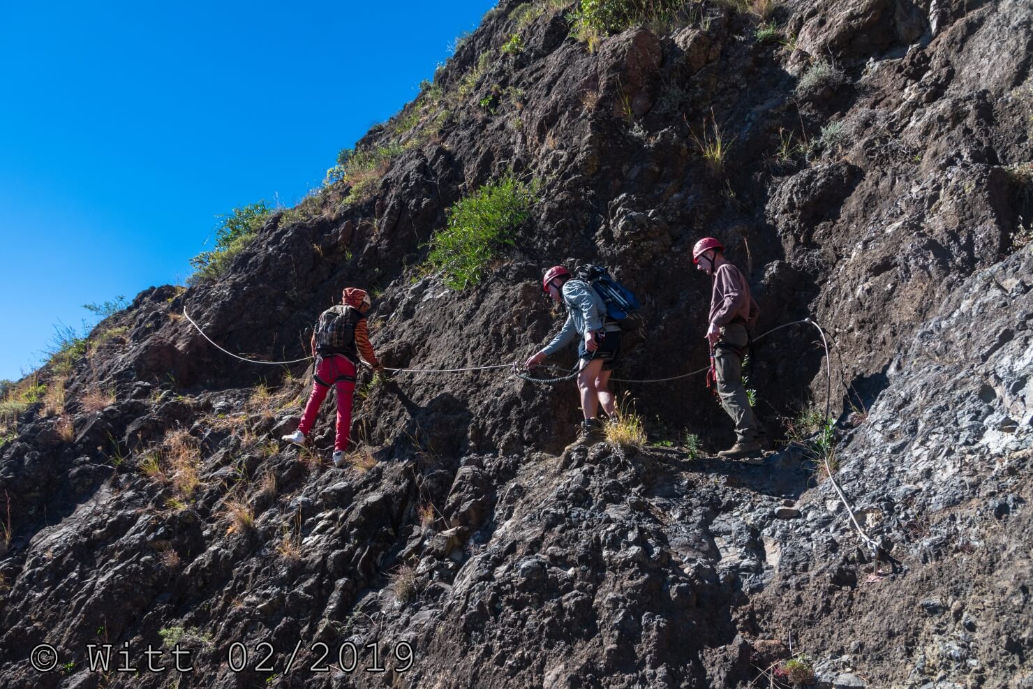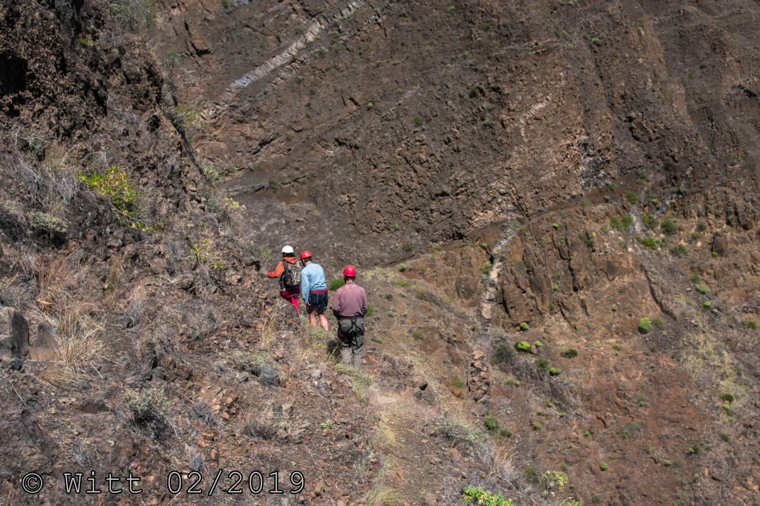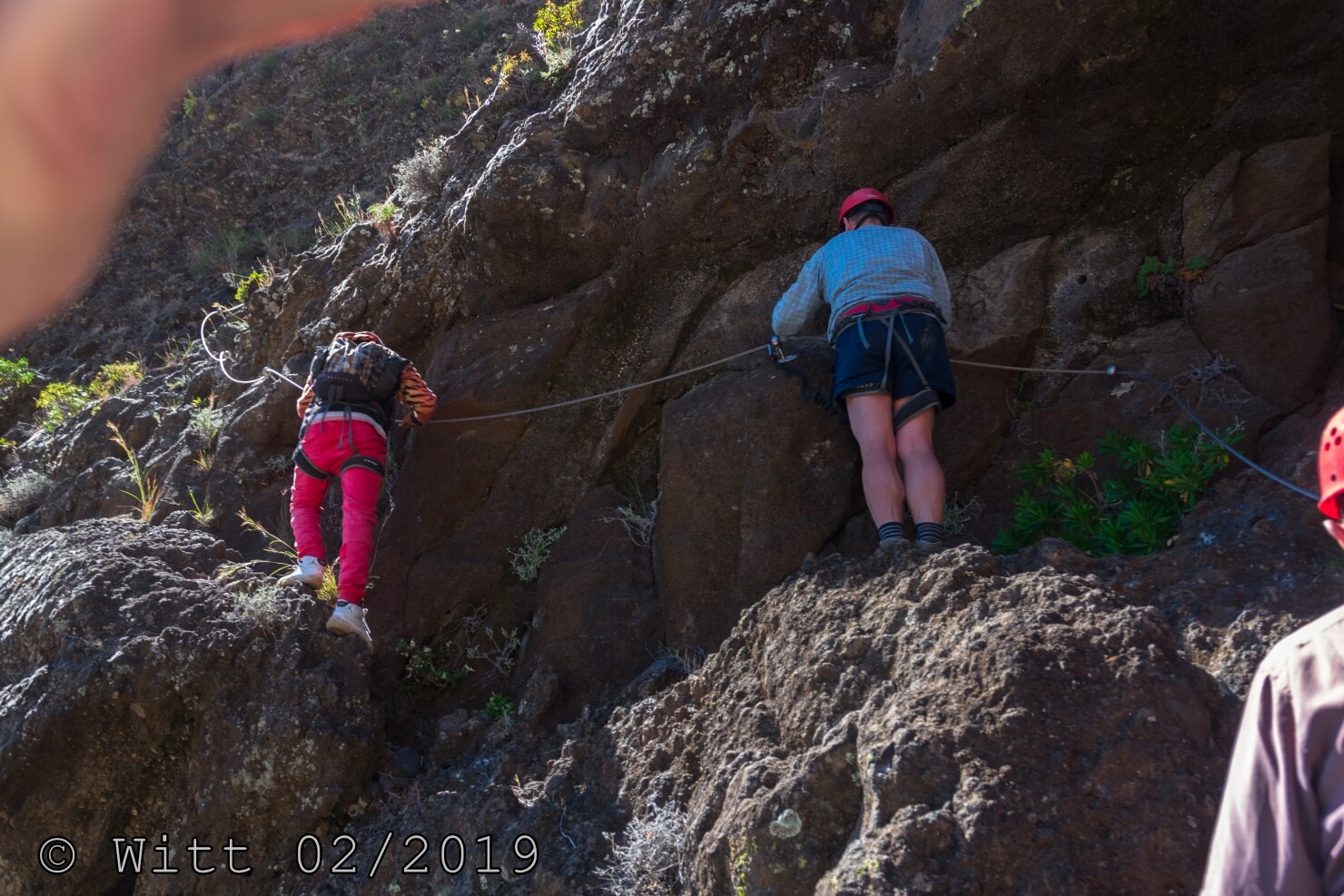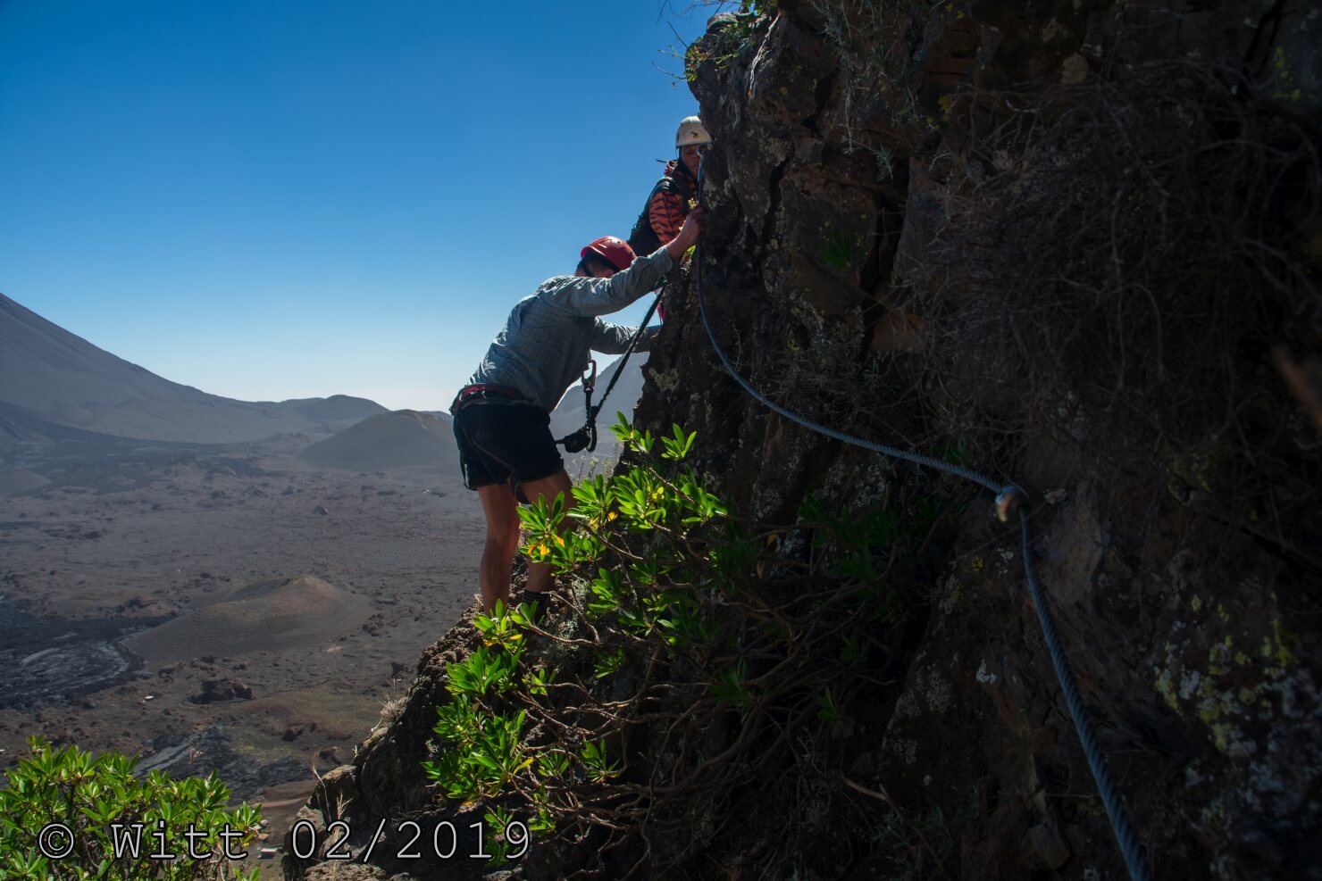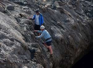 Für den letzten Tag, den Ausstieg über den äußeren Kraterrand hat uns Mustafa, abweichend vom Programm, den Kletterstieg empfohlen. (Der im Programm vorgesehene Ausstieg hätte laut Mustafa 1800 m Abstieg bedeutet, das solltet Ihr vielleicht nochmal in den Reiseunterlagen vermerken) Es gibt zwei Kletterstiege, einen leichten und einen schweren. Wir haben natürlich den leichten genommen. Etwa ein Viertel der Wanderung macht der Kletterstieg aus. Ich kann den nur empfehlen. Er ist in einem Top Zustand. Bestes Material und alle Haken sehr sauber einzementiert. Carsten und ich waren zuvor noch nie einen Kletterstieg gegangen und wir haben es locker geschafft und nicht bereut. Schwindelfreiheit und Trittsicherheit sind natürlich erforderlich. Danach ging es 3 h sehr leicht und angenehm oben auf dem äußeren Kraterrand mit schönster Aussicht.