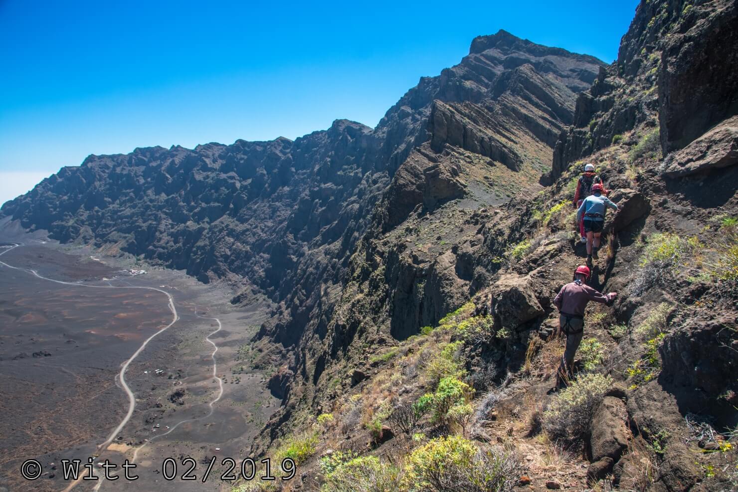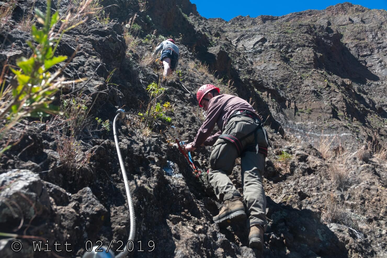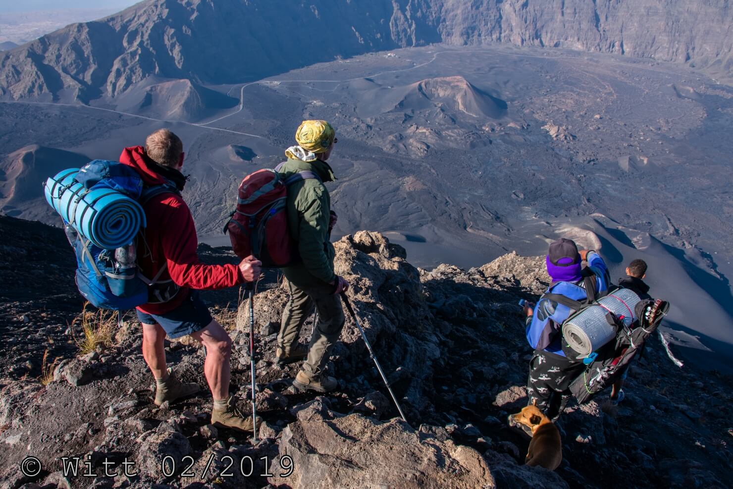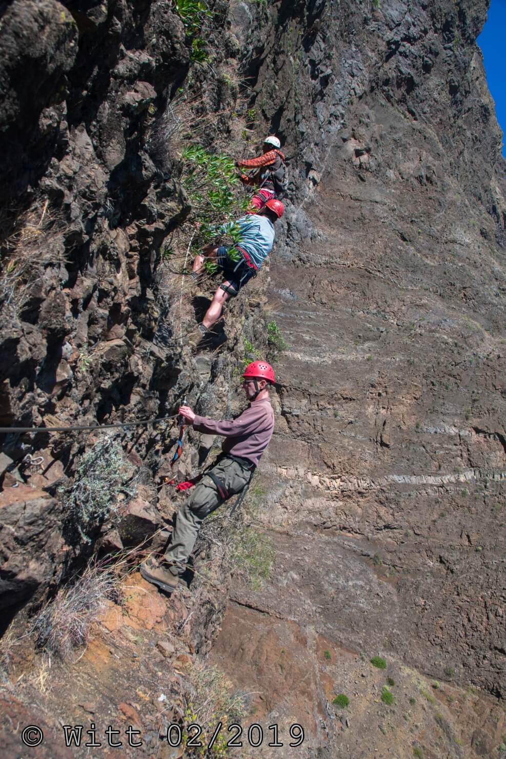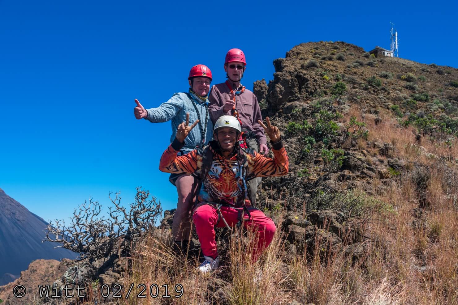 Für den letzten Tag, den Ausstieg über den äußeren Kraterrand hat uns Mustafa, abweichend vom Programm, den Kletterstieg empfohlen. (Der im Programm vorgesehene Ausstieg hätte laut Mustafa 1800 m Abstieg bedeutet, das solltet Ihr vielleicht nochmal in den Reiseunterlagen vermerken) Es gibt zwei Kletterstiege, einen leichten und einen schweren. Wir haben natürlich den leichten genommen. Etwa ein Viertel der Wanderung macht der Kletterstieg aus. Ich kann den nur empfehlen. Er ist in einem Top Zustand. Bestes Material und alle Haken sehr sauber einzementiert. Carsten und ich waren zuvor noch nie einen Kletterstieg gegangen und wir haben es locker geschafft und nicht bereut. Schwindelfreiheit und Trittsicherheit sind natürlich erforderlich. Danach ging es 3 h sehr leicht und angenehm oben auf dem äußeren Kraterrand mit schönster Aussicht.