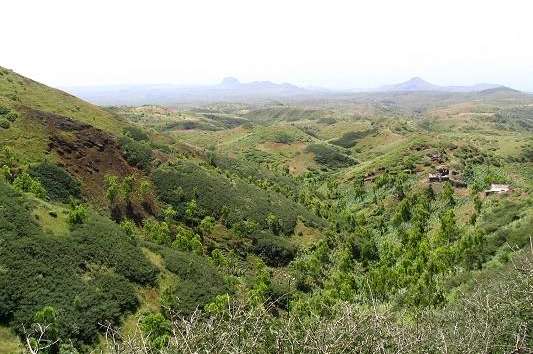Nach einem weiteren Anstieg sehen wir dann auch schon unser Ziel vor Augen, die kapverdische Sommerfrische Rui Vaz. Durch leicht hügeliges Gelände erreichen wir dann die Pflasterstraße die von Rui Vaz zum "Radarberg" Monte Txota führt. Die Quinta Montanha ist u.a. bekannt für ihr sonntägliches Self-Service Buffet
