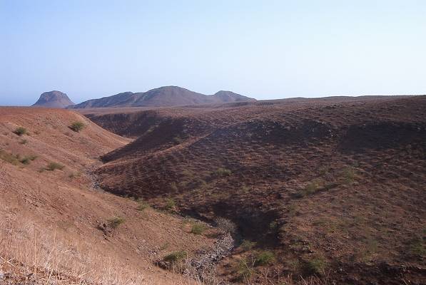 Direkt bei Santa Ana beginne wir mit dem Aufstieg. Um dann hinter Montes den von Salinero kommenden Feldweg zu queren. Noch vor Achada Loura schlagen wir uns dann rechts ins Gelände. Schon vor Chao Grande hat man im flachen Gelände weite Blick Richtung der Hauptstadt Praia.