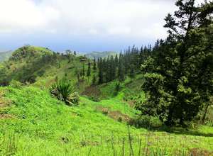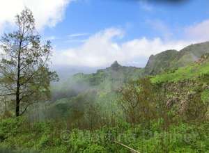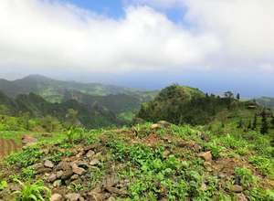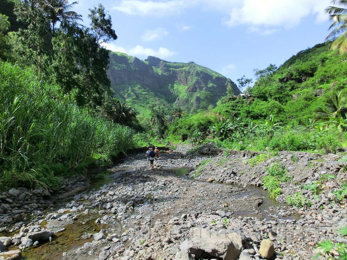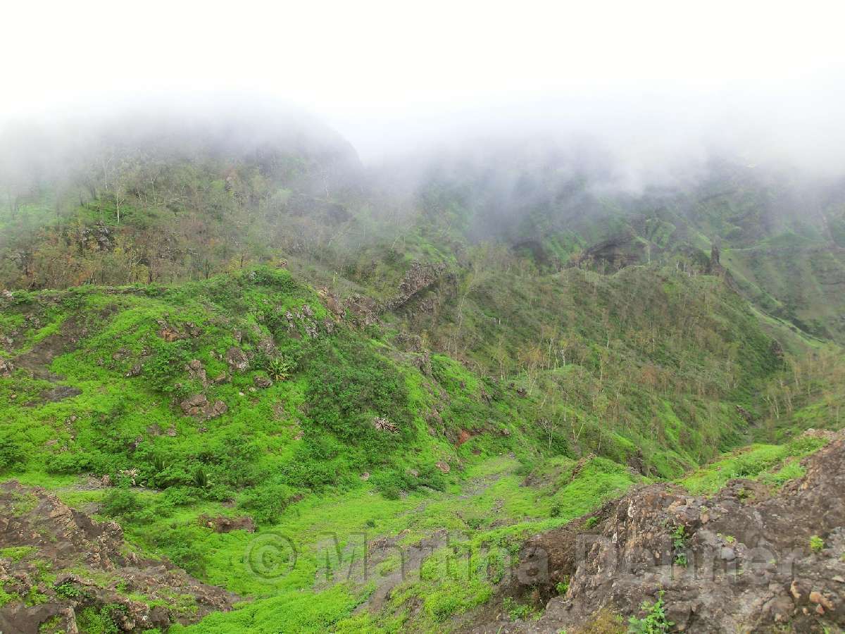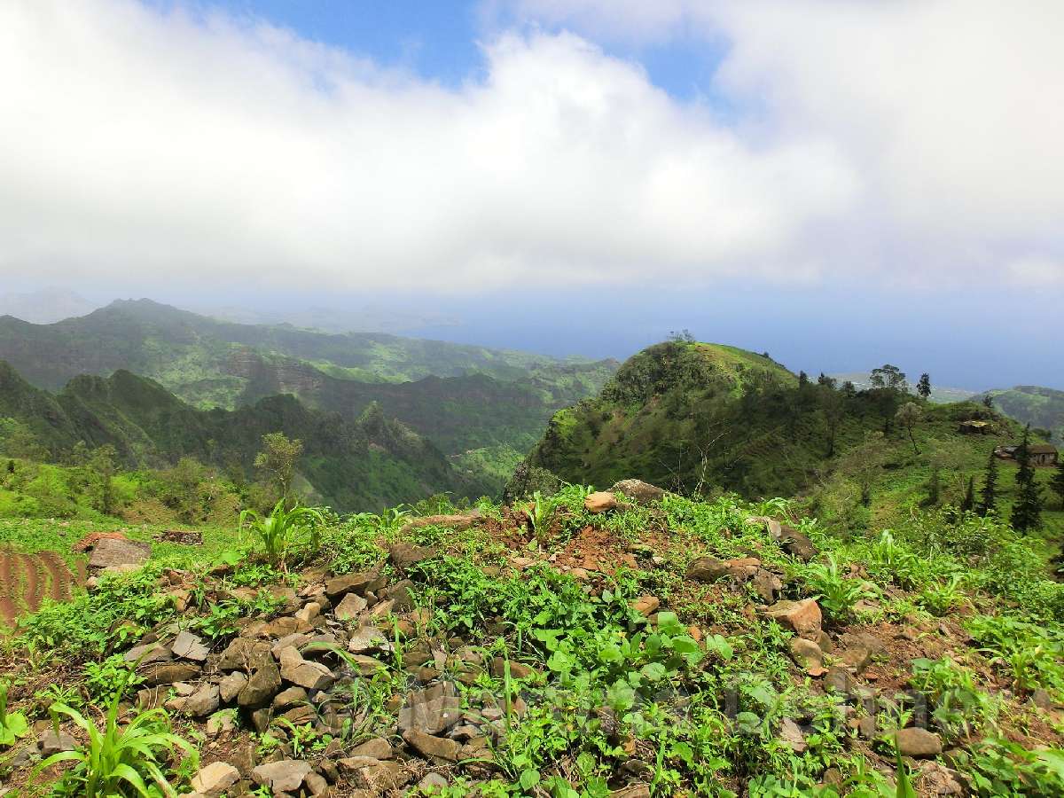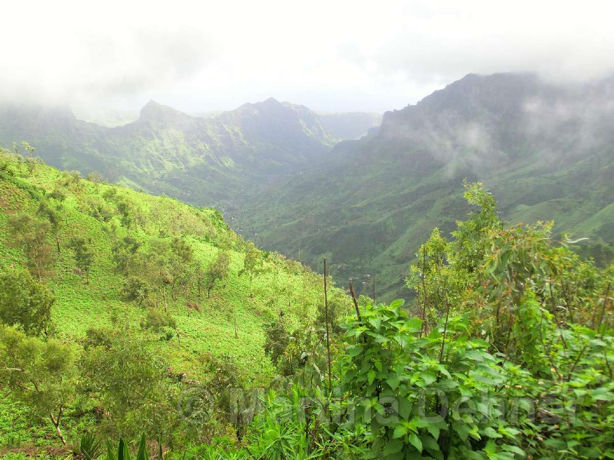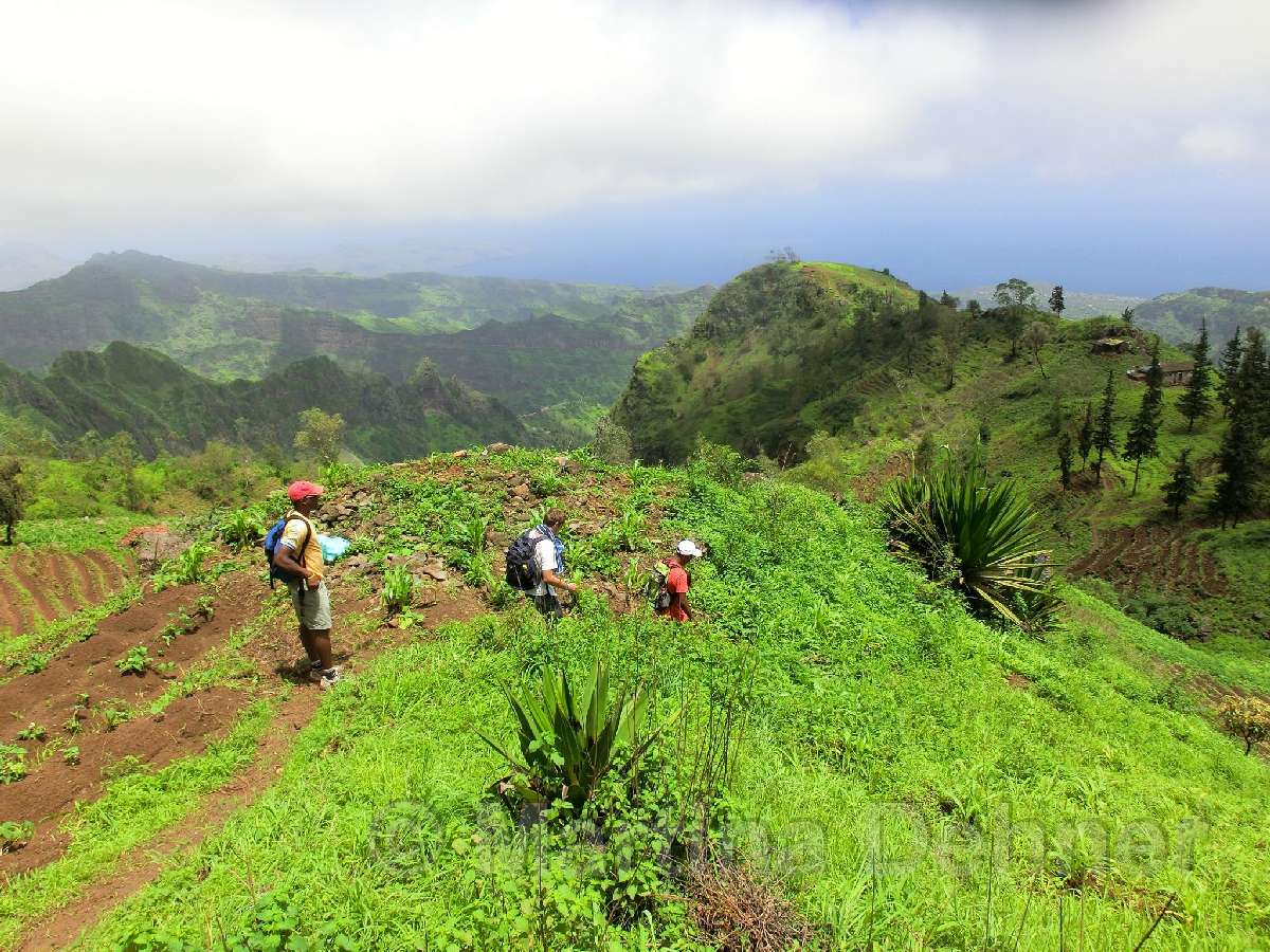 Von hier aus führ der Weg wieder nach unten. Auf schmalen Wegen geht es durch die Felder der Kapverdianer hinunter. Trittsicherheit ist gefordert, denn immer wieder liegen Steine oder Wurzeln auf dem steilen Weg bergab. Dennoch belohnt die Tour auf ganzer Stecke mit herrlichen Ausblicken und schattenspendenden Mangobäumen.