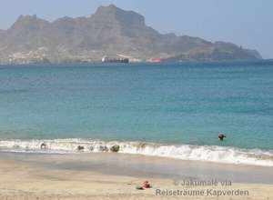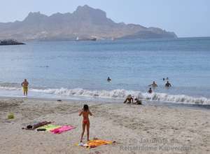 Am späten Nachmittag gehen wir zum beliebtesten Strand in Mindelo, nach Lajinha. Hier treffen sich jung und alt zum entspannen. Es gibt eine ganze Reihe von Strandbars, in denen man für wenig Geld erfrischende Getränke bekommt. Der ein oder andere nutzt die Zeit für ein weiteres Bad im Meer. Es reicht aber auch, einfach nur da zu sitzen und dem gemächlichen Treiben zu zuschauen. "Cabo Verde-no stress", so ist es überall zu lesen, und es ist tatsächlich so. Hier ist alles ein wenig unaufgeregter und weniger hektisch. Die Menschen, obgleich nach unseren Maßstäben arm, strahlen eine ansteckende Lebensfreude und Ausgeglichenheit aus, die man in unseren Breiten oft vermisst.