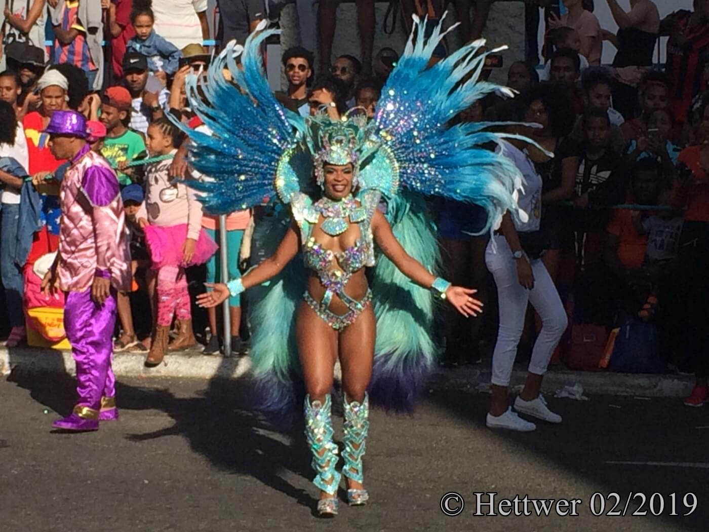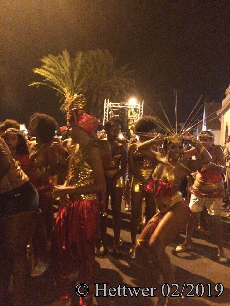 Unser Fahrer stand am Hafen bereit und brachte uns in die tolle Unterkunft MiMaGui. Ein tolles Zimmer mit einer riesigen Terrasse, auf der uns jeden Morgen für uns allein das Frühstück serviert wurde und wir dabei gemütlich das Geschehen im Hafen beobachten konnten. Der Naturhafen ist einer der größten im Atlantik und liegt in einem versunkenen Krater. Es ist ein herrlicher Ausblick, den wir jeden Tag aufs Neue genossen, bevor wir uns auf den Weg in die City der modernen Kulturhauptstadt der Kapverden machten, wofür wir zu Fuß maximal 10 Minuten brauchten. Bevor wir uns in das Karnevalgetümmel stürzten, dem man in dieser Stadt nur entgehen kann, wenn man rechtzeitig abreist, buchte uns Jorges, der Hausherr noch eine Inselrundfahrt, unter anderem auf den höchsten Berg, den Monte Verde von dem aus man eine tolle Aussicht auf die anderen Inseln haben sollte. Als wir den Gipfel erreichten standen wir allerdings bei Sturm und Kälte in den Wolken, sahen gar nichts und machten uns nach wenigen Minuten auf den Weg zurück in die Wärme. Bereits am späten Nachmittag begannen in der Stadt die ersten Umzüge und als wir am Abend aus dem Restaurant Nautilus kamen, in dem es übrigens sehr gutes Essen gibt, war auf den Straßen kein Durchkommen mehr. Wir hatten den Eindruck, dass von den 79.000 Einwohnern dieser Stadt niemand mehr zuhause war. Das Spektakel in der Nacht war einzigartig! Allerdings muss man bei dem Gewühle und Gedränge unbedingt auf die Taschendiebe achten, die jede Chance nutzen und auch bei uns einen Versuch unternahmen. Für den großen Umzug am Dienstag kauften wir uns in einem großen Hotel in der Innenstadt zwei Sitzplätze auf deren Tribühne. Die Menschen saßen auf Mauern, Bäumen und errichteten auf der Straße regelrechte Lager. Da hätten wir keine Chance gehabt, die aufregenden Ereignisse zu beobachten. Man muss kein Fastnachts-/Karnevalfan sein, um ein solches Ereignis mit ungläubigem Staunen zu verfolgen.