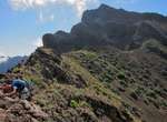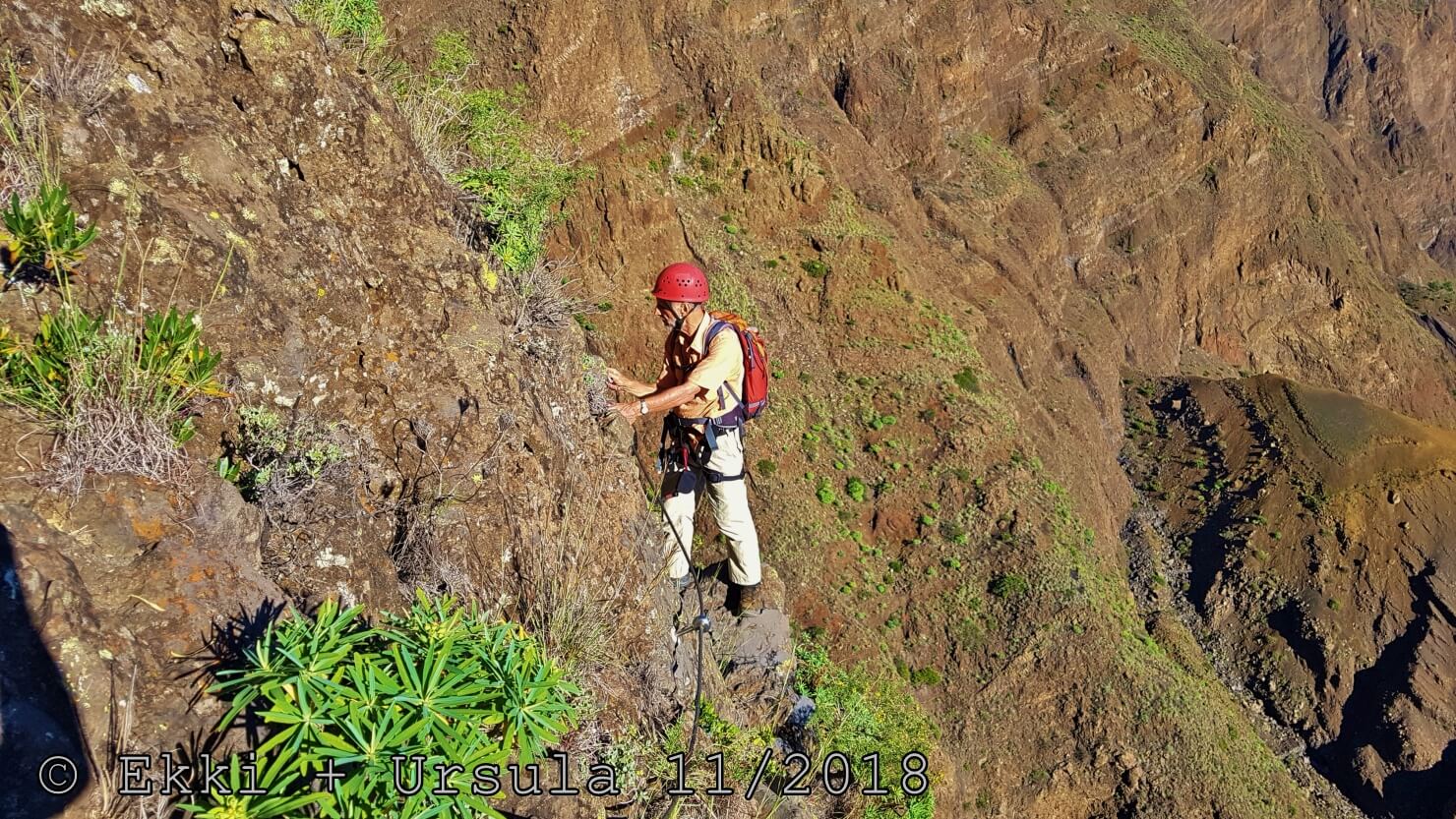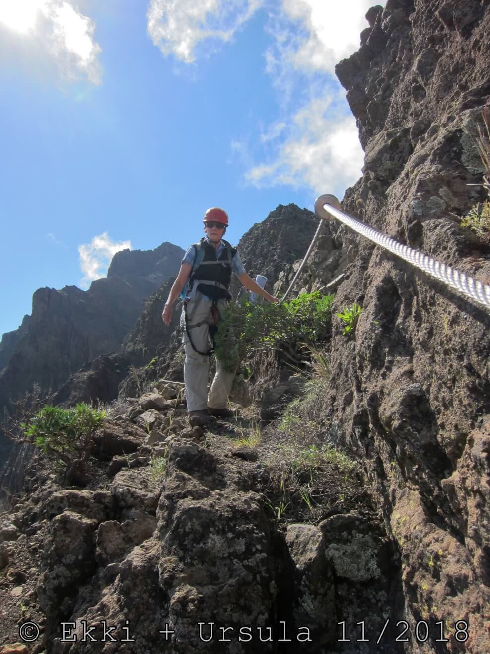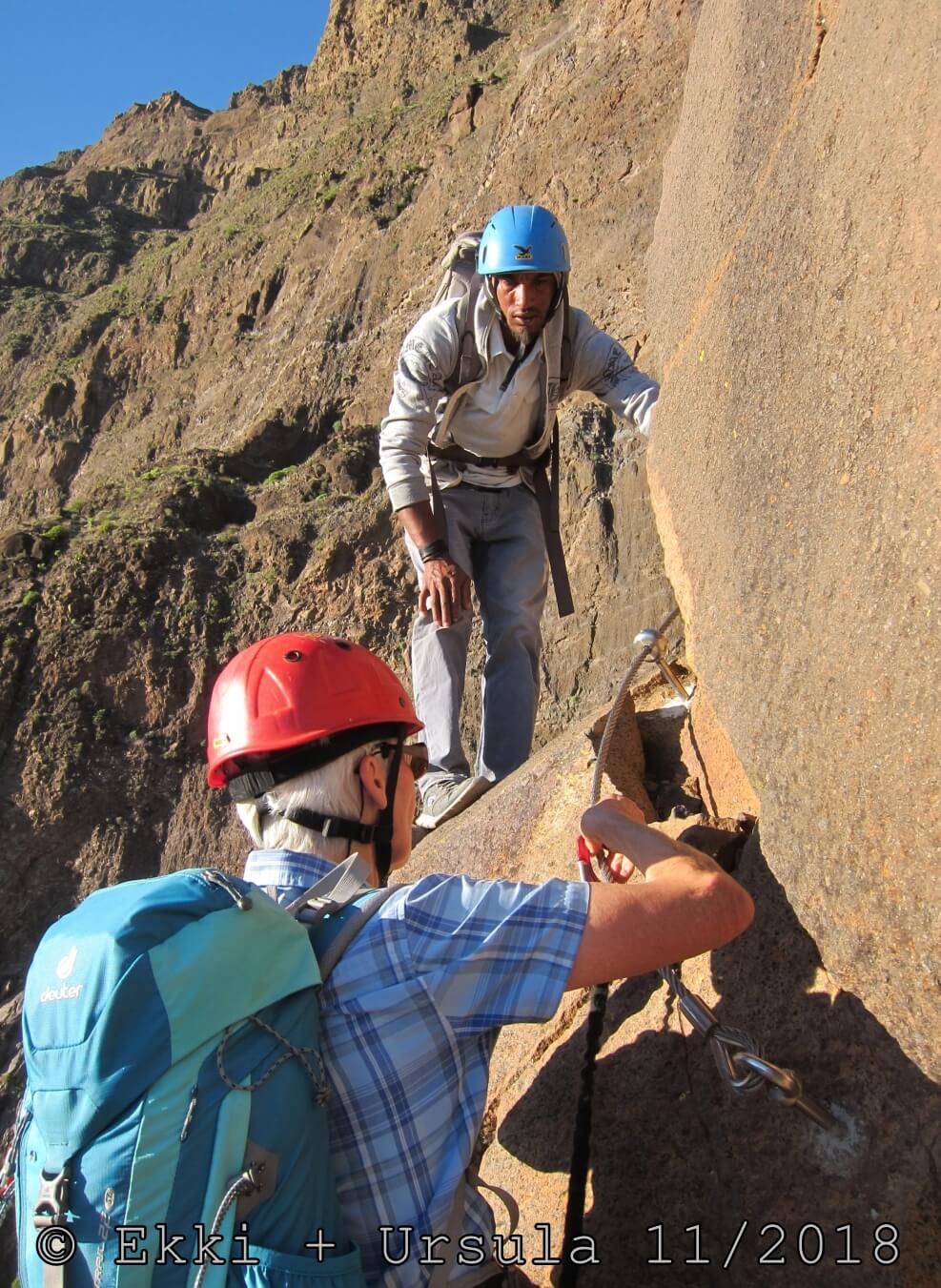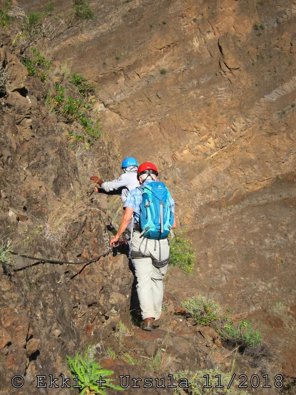 Es ist alles so wie von Pitt und von Mustafa beschrieben, wirklich „leichter“ Klettersteig, Stufe A/B . Sibylle, also den kannst Du auf alle Fälle machen, so wie ich Dich kenne, ist nicht viel schlimmer als wir mit Dir in Santiago Cidade Velha ins Ribeira Grande gestiegen sind über die Grogue Brennerei. Es ist halt nur ausgesetzter und steiler in der Bordeira Wand, das ist alles. Aber durch die Stahlseil-Sicherungen ist der Steig super sicher und. Du kannst auch die Zeiten gut abschätzen, also wir haben mit Pause in der Scharte von 9:00 Uhr (Einstieg) bis 12:45 Uhr (Gipfel Ponte Alto do Sul) = ca. 4 h von 1.750 m auf 2.400 m = 650 Hm benötigt. Aber anstrengend ist das auch, die Höhenmeter muss man steigen, senkrechter mit Bein und teilweise Handarbeit. Oben haben wir dann bis um 13:30 Uhr auf Raimar gewartet, der über den Weg 212 zum Gipfel kam, er hat also länger gebraucht als wir für den Steig. Mit ihm sind wir dann zurück über den Weg Nr. 212 gegangen bis Monte Cruz (ab 14 Uhr bis 16:30 Uhr = 2,5 Std.).