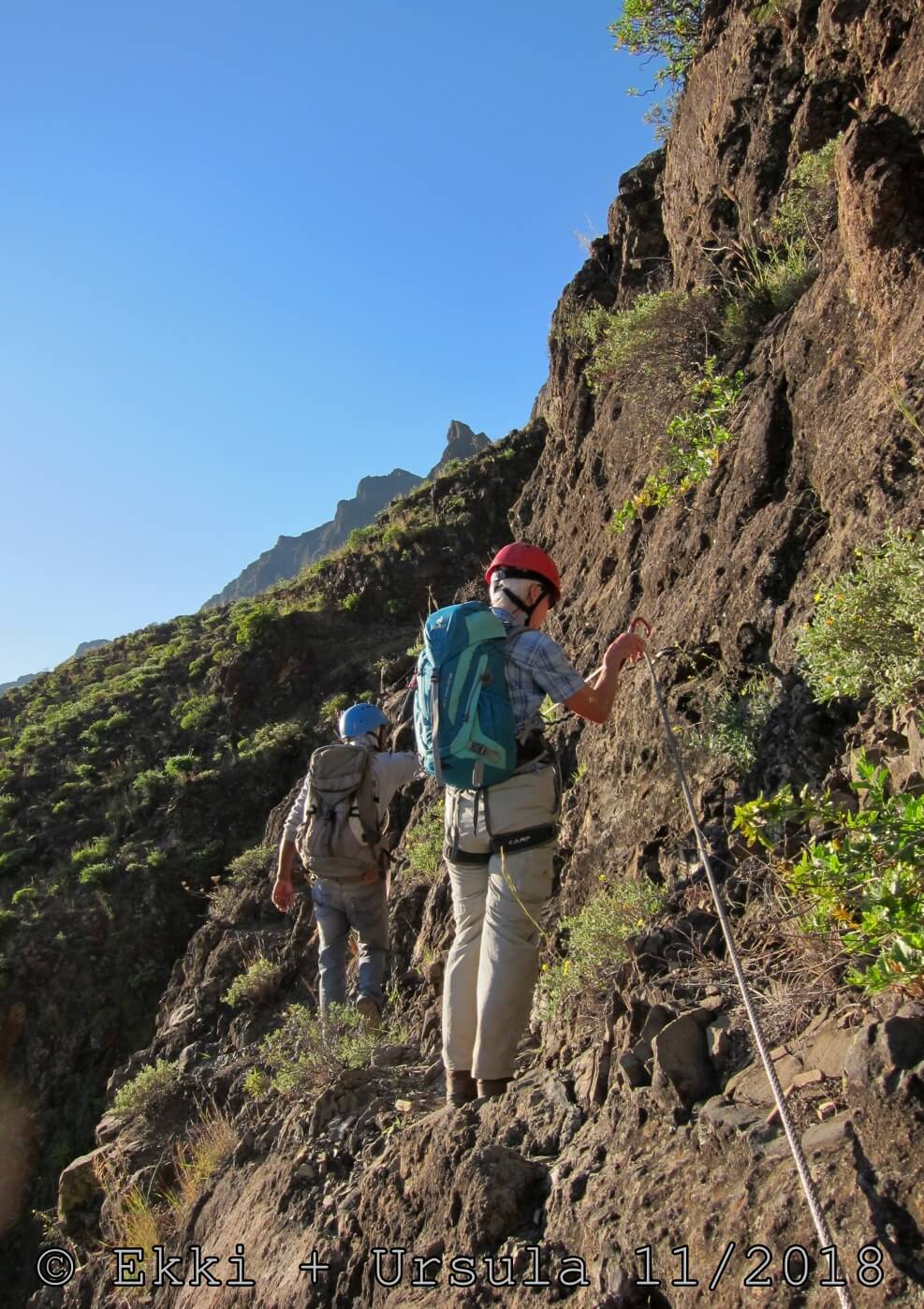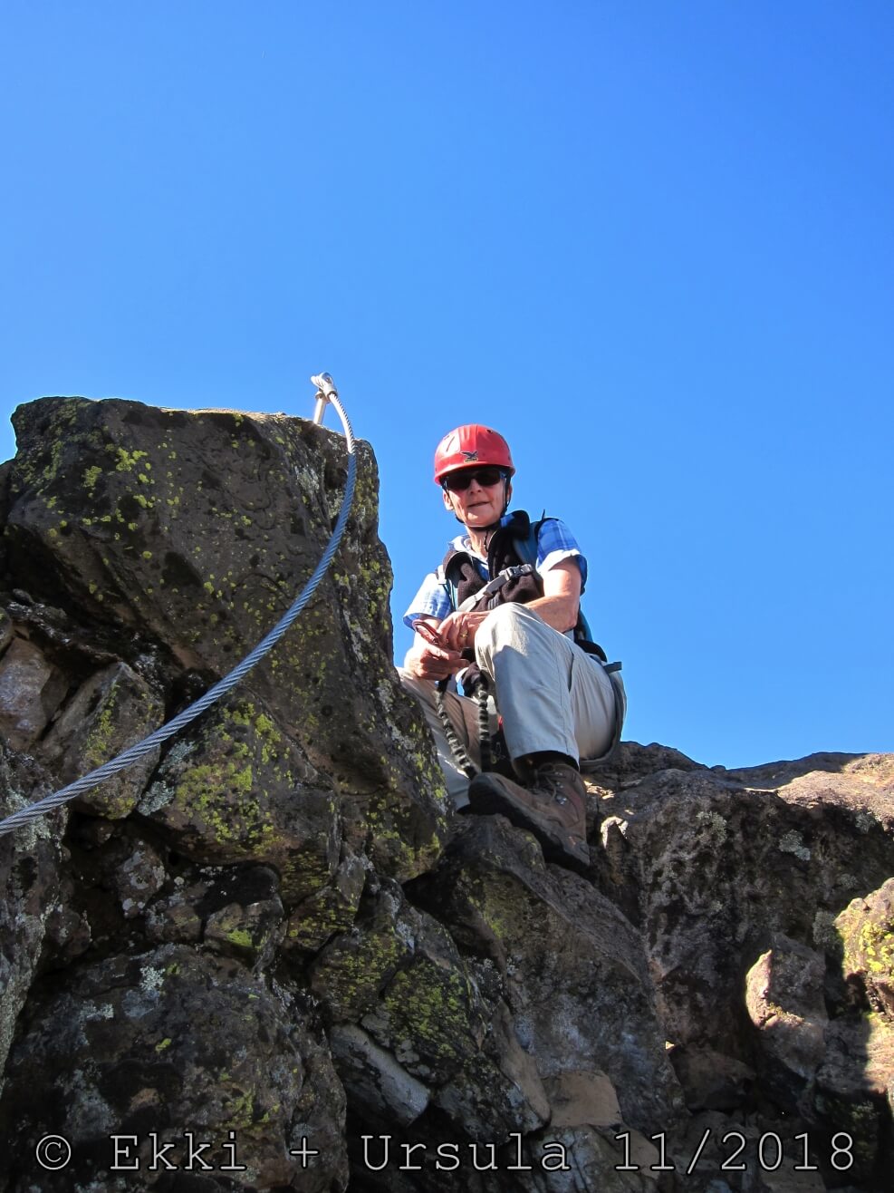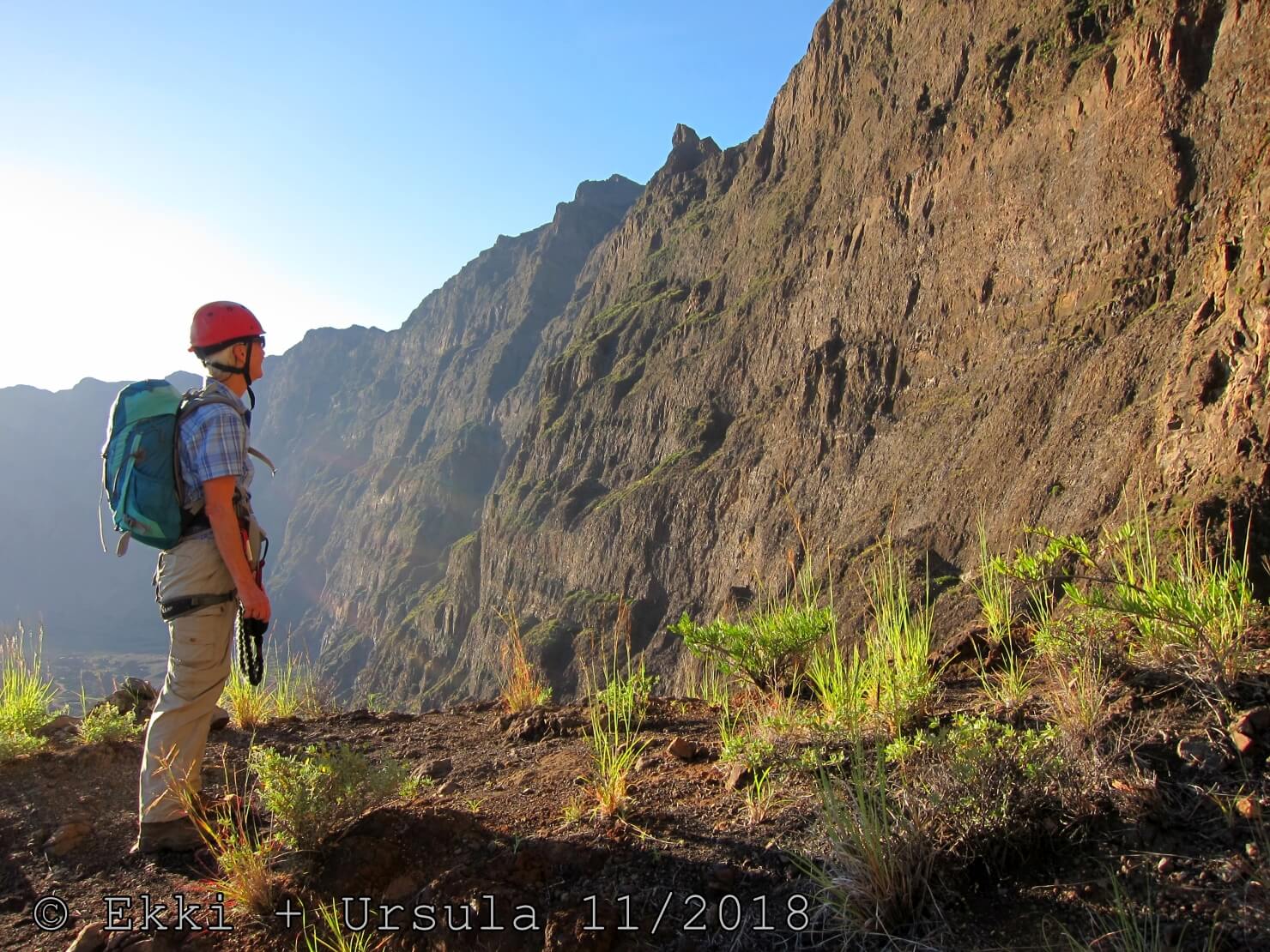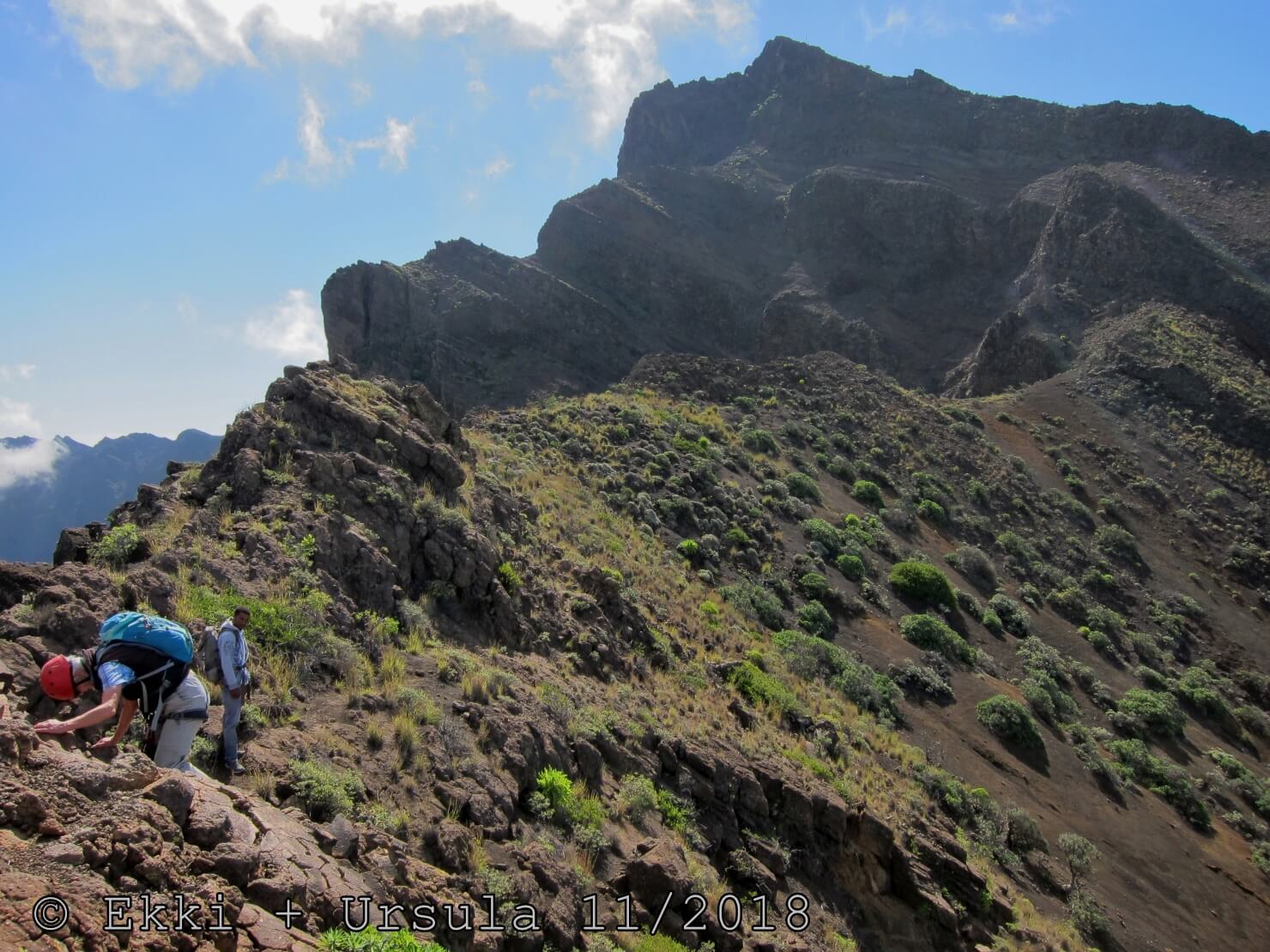 Es ist alles so wie von Pitt und von Mustafa beschrieben, wirklich „leichter“ Klettersteig, Stufe A/B . Sibylle, also den kannst Du auf alle Fälle machen, so wie ich Dich kenne, ist nicht viel schlimmer als wir mit Dir in Santiago Cidade Velha ins Ribeira Grande gestiegen sind über die Grogue Brennerei. Es ist halt nur ausgesetzter und steiler in der Bordeira Wand, das ist alles. Aber durch die Stahlseil-Sicherungen ist der Steig super sicher und. Du kannst auch die Zeiten gut abschätzen, also wir haben mit Pause in der Scharte von 9:00 Uhr (Einstieg) bis 12:45 Uhr (Gipfel Ponte Alto do Sul) = ca. 4 h von 1.750 m auf 2.400 m = 650 Hm benötigt. Aber anstrengend ist das auch, die Höhenmeter muss man steigen, senkrechter mit Bein und teilweise Handarbeit. Oben haben wir dann bis um 13:30 Uhr auf Raimar gewartet, der über den Weg 212 zum Gipfel kam, er hat also länger gebraucht als wir für den Steig. Mit ihm sind wir dann zurück über den Weg Nr. 212 gegangen bis Monte Cruz (ab 14 Uhr bis 16:30 Uhr = 2,5 Std.).