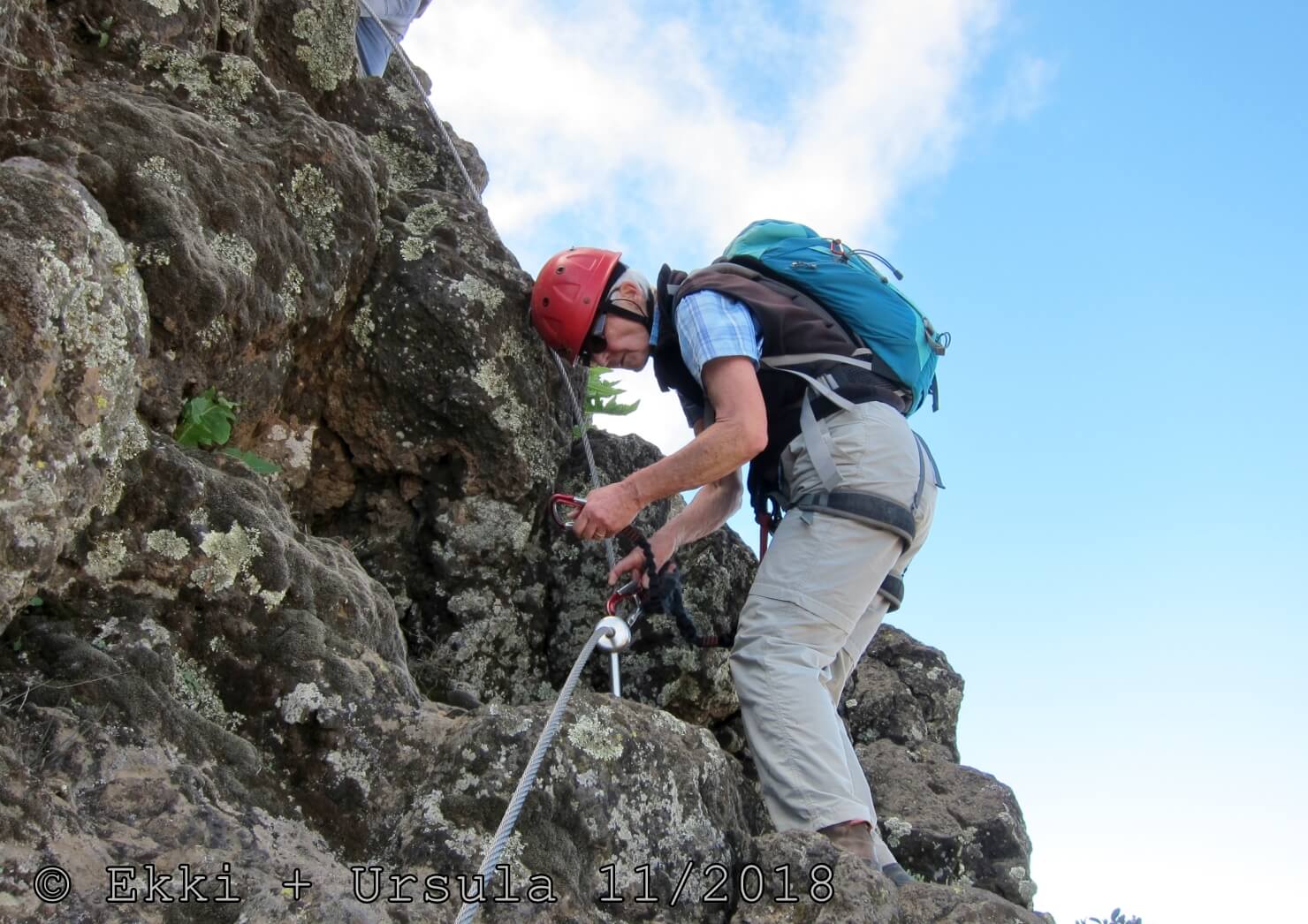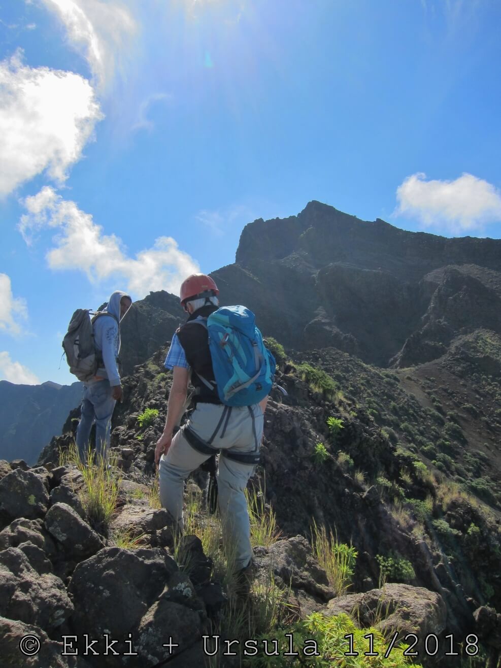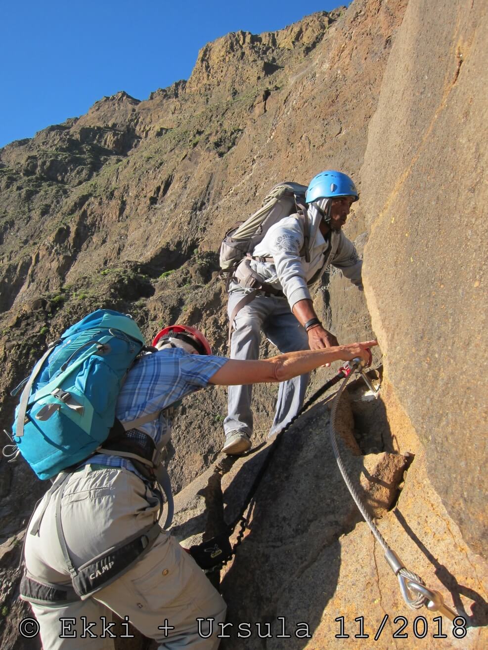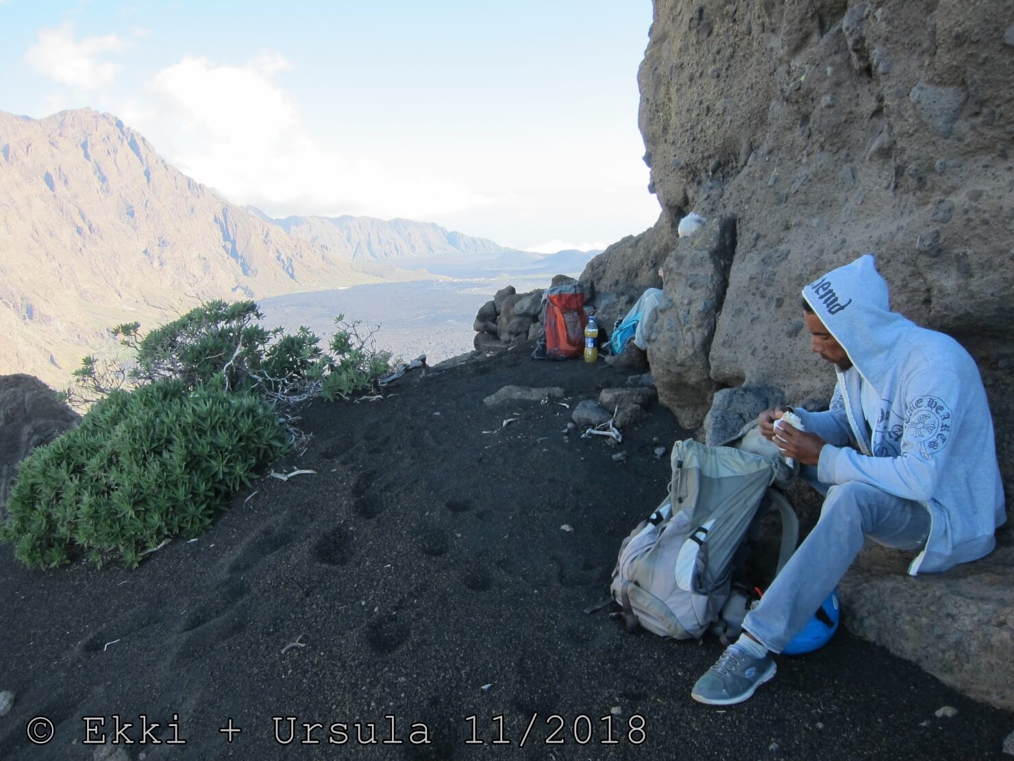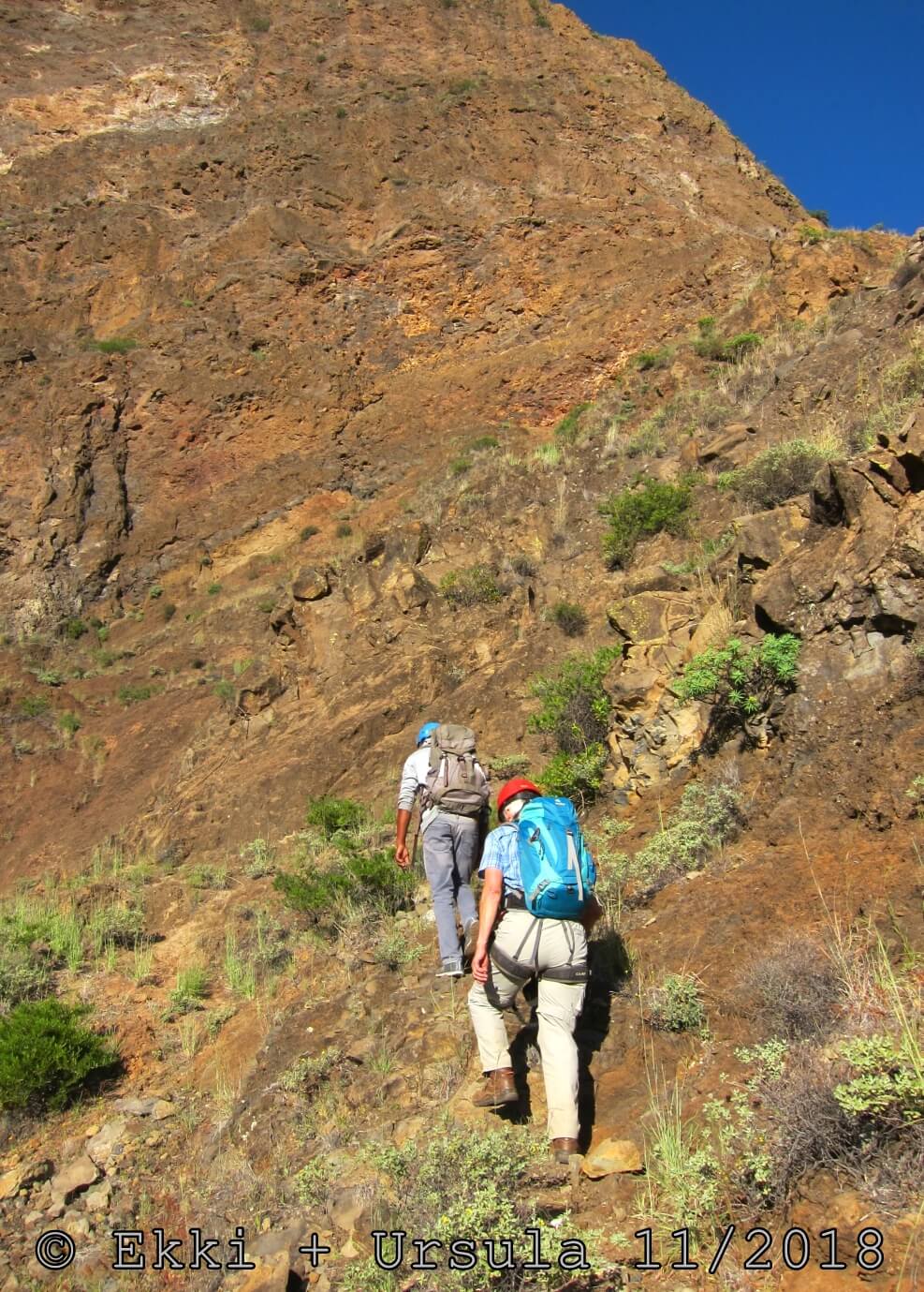 Es ist alles so wie von Pitt und von Mustafa beschrieben, wirklich „leichter“ Klettersteig, Stufe A/B . Sibylle, also den kannst Du auf alle Fälle machen, so wie ich Dich kenne, ist nicht viel schlimmer als wir mit Dir in Santiago Cidade Velha ins Ribeira Grande gestiegen sind über die Grogue Brennerei. Es ist halt nur ausgesetzter und steiler in der Bordeira Wand, das ist alles. Aber durch die Stahlseil-Sicherungen ist der Steig super sicher und. Du kannst auch die Zeiten gut abschätzen, also wir haben mit Pause in der Scharte von 9:00 Uhr (Einstieg) bis 12:45 Uhr (Gipfel Ponte Alto do Sul) = ca. 4 h von 1.750 m auf 2.400 m = 650 Hm benötigt. Aber anstrengend ist das auch, die Höhenmeter muss man steigen, senkrechter mit Bein und teilweise Handarbeit. Oben haben wir dann bis um 13:30 Uhr auf Raimar gewartet, der über den Weg 212 zum Gipfel kam, er hat also länger gebraucht als wir für den Steig. Mit ihm sind wir dann zurück über den Weg Nr. 212 gegangen bis Monte Cruz (ab 14 Uhr bis 16:30 Uhr = 2,5 Std.).