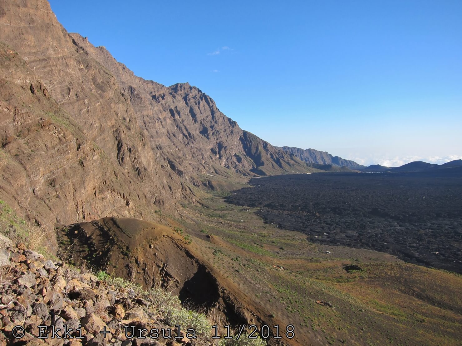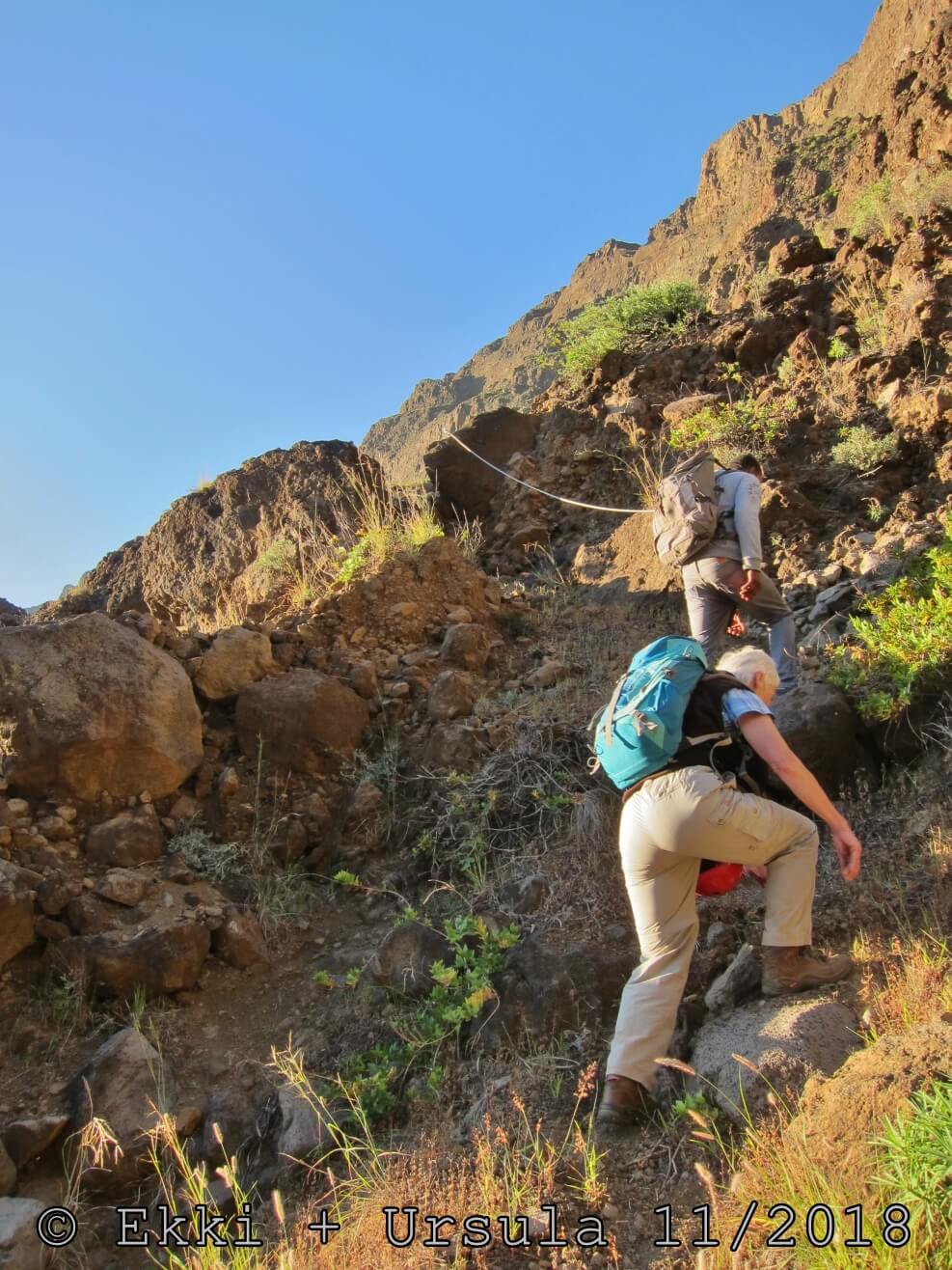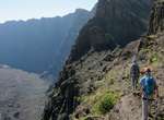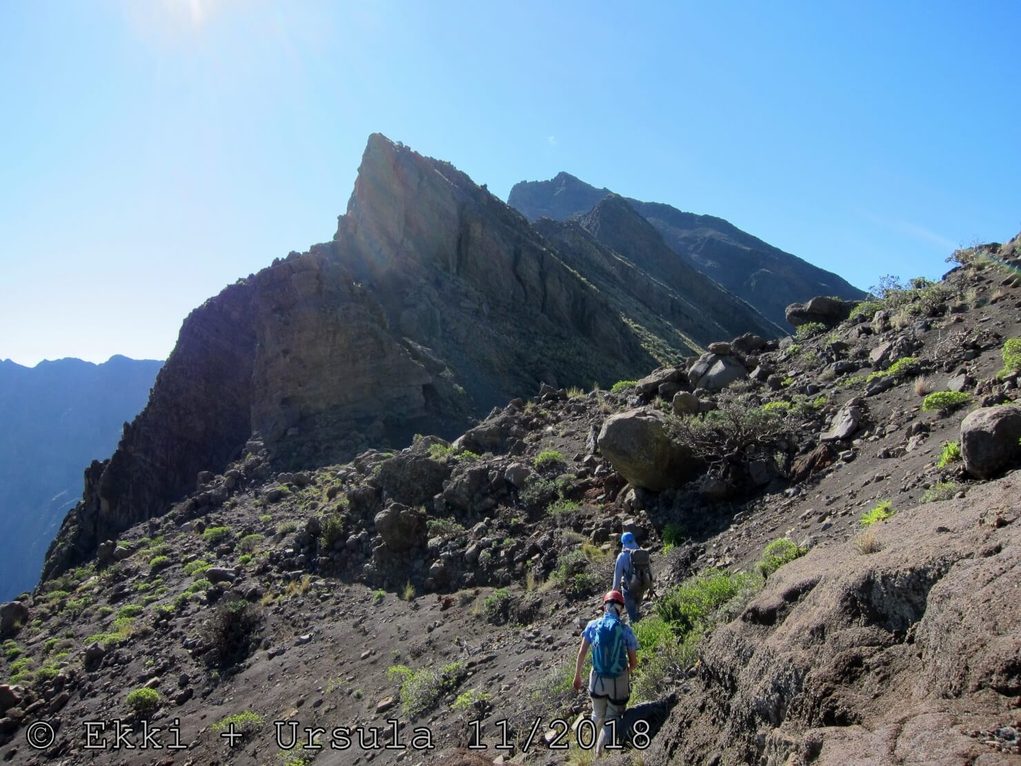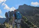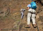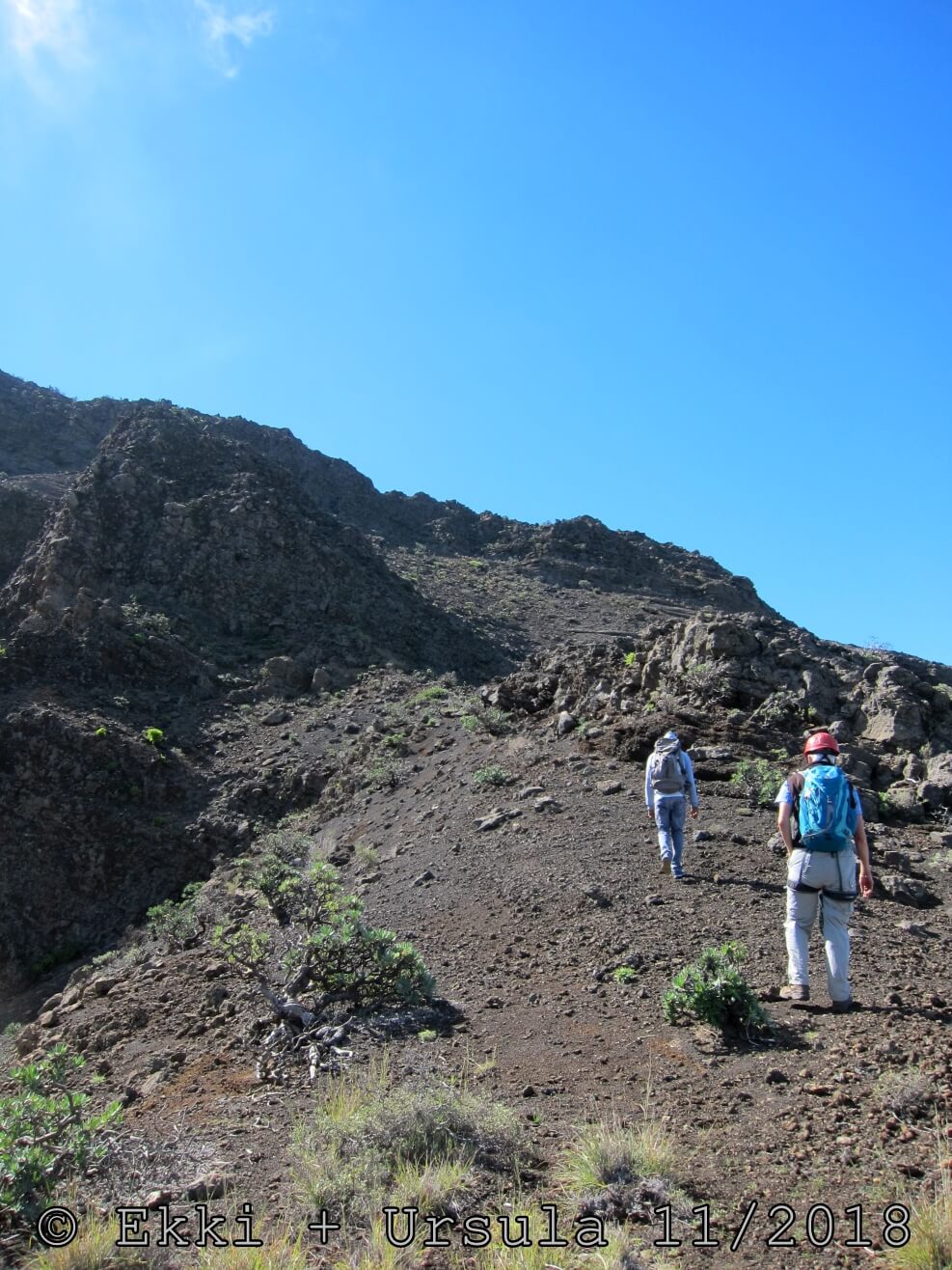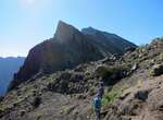Es ist alles so wie von Pitt und von Mustafa beschrieben, wirklich „leichter“ Klettersteig, Stufe A/B . Sibylle, also den kannst Du auf alle Fälle machen, so wie ich Dich kenne, ist nicht viel schlimmer als wir mit Dir in Santiago Cidade Velha ins Ribeira Grande gestiegen sind über die Grogue Brennerei. Es ist halt nur ausgesetzter und steiler in der Bordeira Wand, das ist alles. Aber durch die Stahlseil-Sicherungen ist der Steig super sicher und. Du kannst auch die Zeiten gut abschätzen, also wir haben mit Pause in der Scharte von 9:00 Uhr (Einstieg) bis 12:45 Uhr (Gipfel Ponte Alto do Sul) = ca. 4 h von 1.750 m auf 2.400 m = 650 Hm benötigt. Aber anstrengend ist das auch, die Höhenmeter muss man steigen, senkrechter mit Bein und teilweise Handarbeit. Oben haben wir dann bis um 13:30 Uhr auf Raimar gewartet, der über den Weg 212 zum Gipfel kam, er hat also länger gebraucht als wir für den Steig. Mit ihm sind wir dann zurück über den Weg Nr. 212 gegangen bis Monte Cruz (ab 14 Uhr bis 16:30 Uhr = 2,5 Std.).