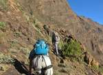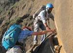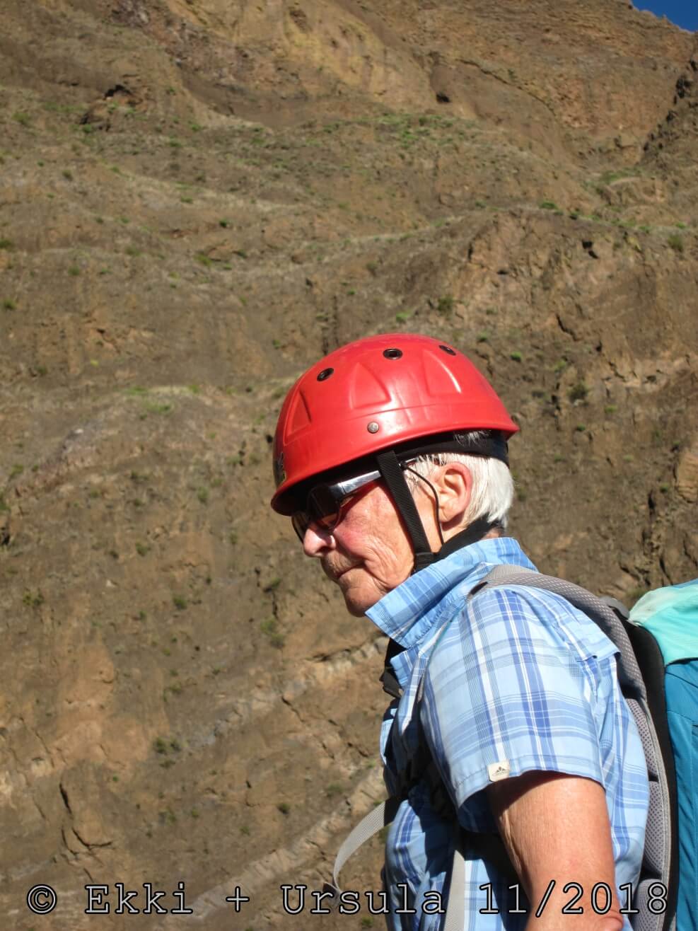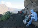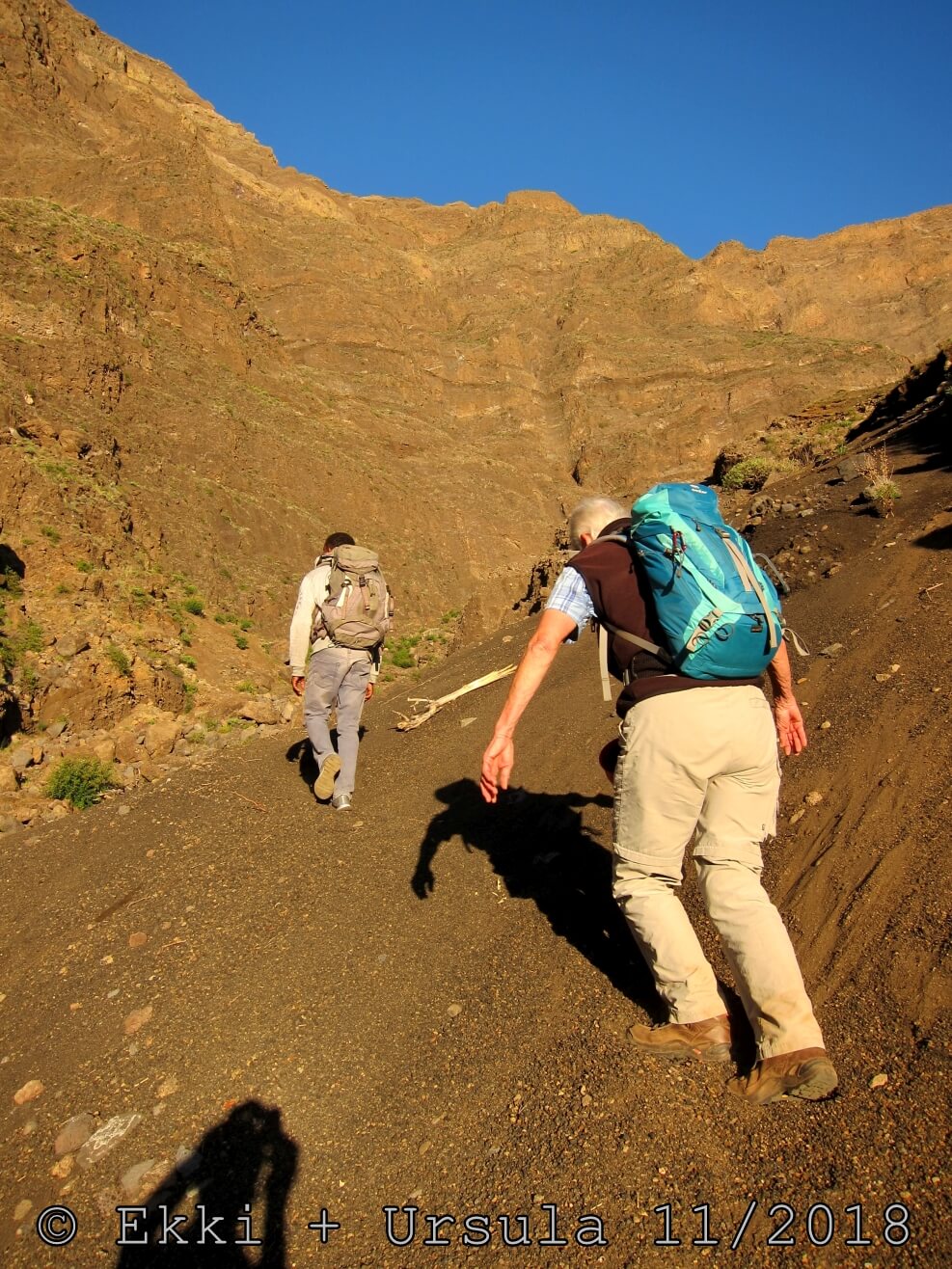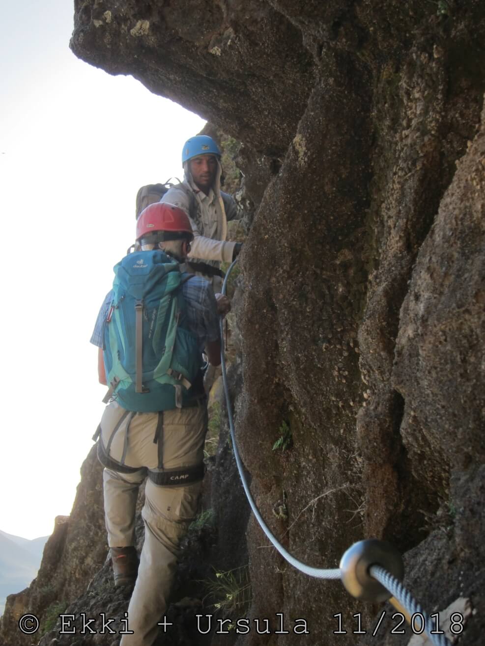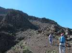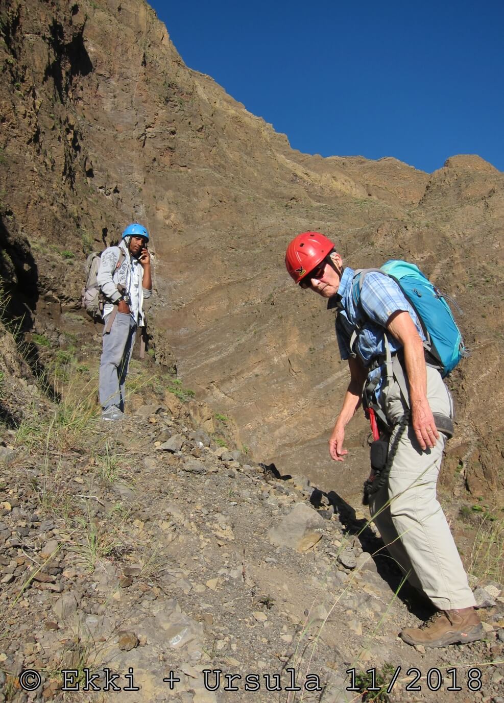 Es ist alles so wie von Pitt und von Mustafa beschrieben, wirklich „leichter“ Klettersteig, Stufe A/B . Sibylle, also den kannst Du auf alle Fälle machen, so wie ich Dich kenne, ist nicht viel schlimmer als wir mit Dir in Santiago Cidade Velha ins Ribeira Grande gestiegen sind über die Grogue Brennerei. Es ist halt nur ausgesetzter und steiler in der Bordeira Wand, das ist alles. Aber durch die Stahlseil-Sicherungen ist der Steig super sicher und. Du kannst auch die Zeiten gut abschätzen, also wir haben mit Pause in der Scharte von 9:00 Uhr (Einstieg) bis 12:45 Uhr (Gipfel Ponte Alto do Sul) = ca. 4 h von 1.750 m auf 2.400 m = 650 Hm benötigt. Aber anstrengend ist das auch, die Höhenmeter muss man steigen, senkrechter mit Bein und teilweise Handarbeit. Oben haben wir dann bis um 13:30 Uhr auf Raimar gewartet, der über den Weg 212 zum Gipfel kam, er hat also länger gebraucht als wir für den Steig. Mit ihm sind wir dann zurück über den Weg Nr. 212 gegangen bis Monte Cruz (ab 14 Uhr bis 16:30 Uhr = 2,5 Std.).