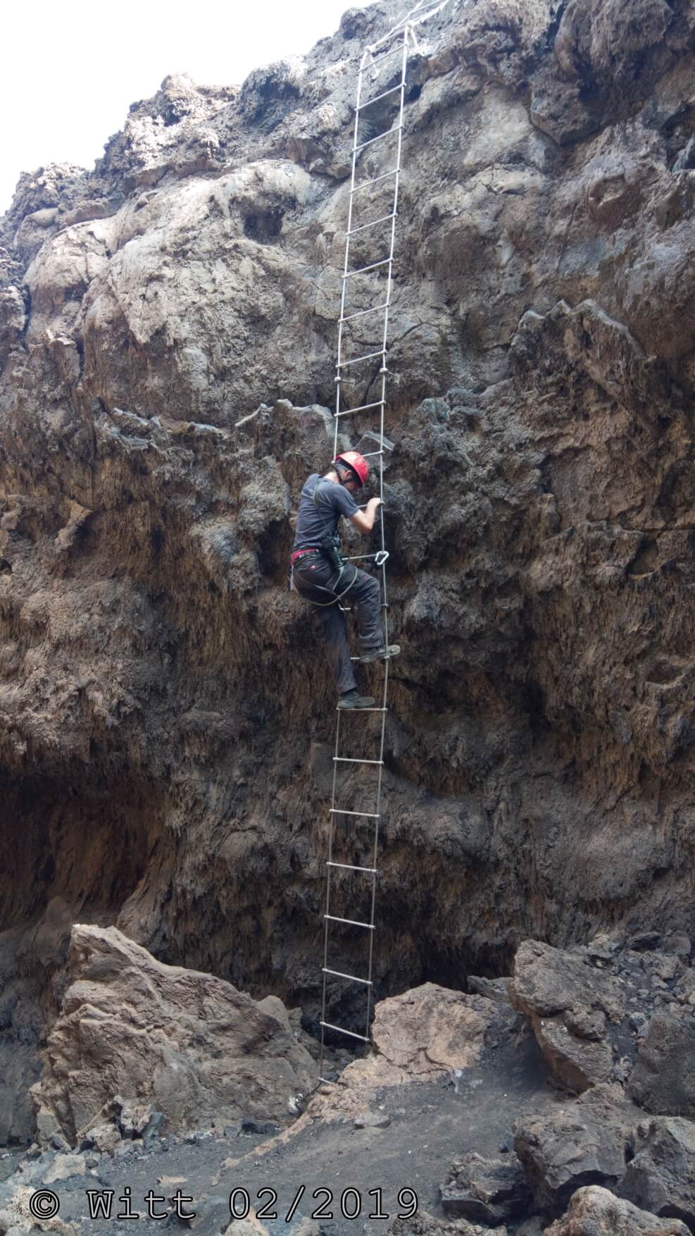 Für den letzten Tag, den Ausstieg über den äußeren Kraterrand hat uns Mustafa, abweichend vom Programm, den Kletterstieg empfohlen. (Der im Programm vorgesehene Ausstieg hätte laut Mustafa 1800 m Abstieg bedeutet, das solltet Ihr vielleicht nochmal in den Reiseunterlagen vermerken) Es gibt zwei Kletterstiege, einen leichten und einen schweren. Wir haben natürlich den leichten genommen. Etwa ein Viertel der Wanderung macht der Kletterstieg aus. Ich kann den nur empfehlen. Er ist in einem Top Zustand. Bestes Material und alle Haken sehr sauber einzementiert. Carsten und ich waren zuvor noch nie einen Kletterstieg gegangen und wir haben es locker geschafft und nicht bereut. Schwindelfreiheit und Trittsicherheit sind natürlich erforderlich. Danach ging es 3 h sehr leicht und angenehm oben auf dem äußeren Kraterrand mit schönster Aussicht.