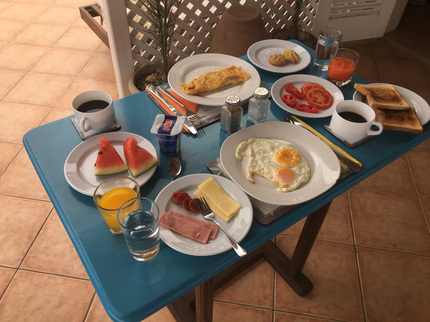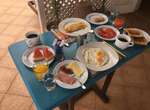 Das leckere Frühstücksbüffet wird auf der Dachterrasse bereit gestellt. Die zentrale Lage zum Strand und den Restaurants ist angenehm.