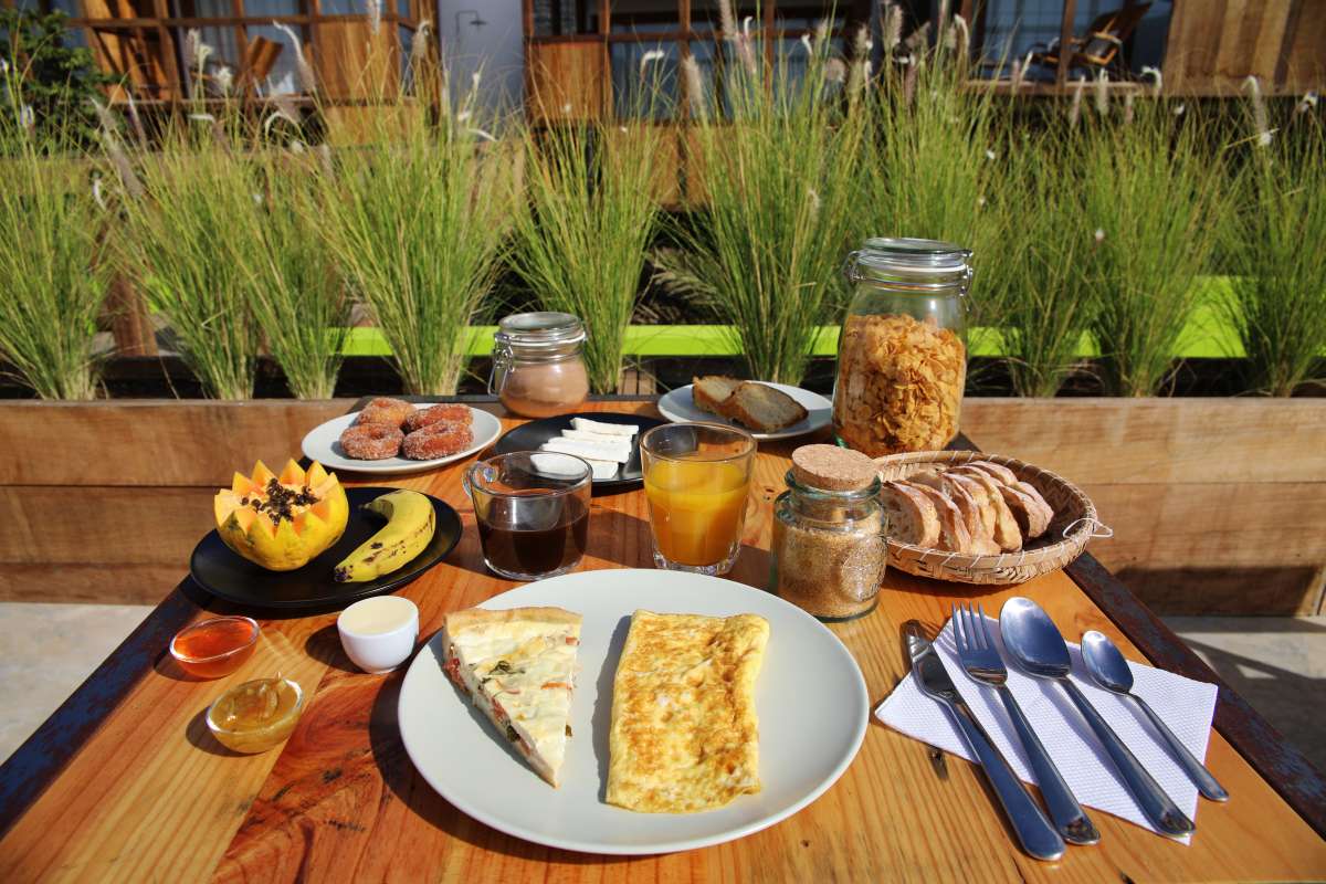 Unterbringung: Die 11 modernen, lichtdurchfluteten Zimmer, sowie eine Suite haben alle ein eigenes Bad/WC, Ventilator, ein Panoramafenster, sowie einen Balkon mit Hängematte. Dem Konzept des Hauses entsprechend gibt es kein TV.